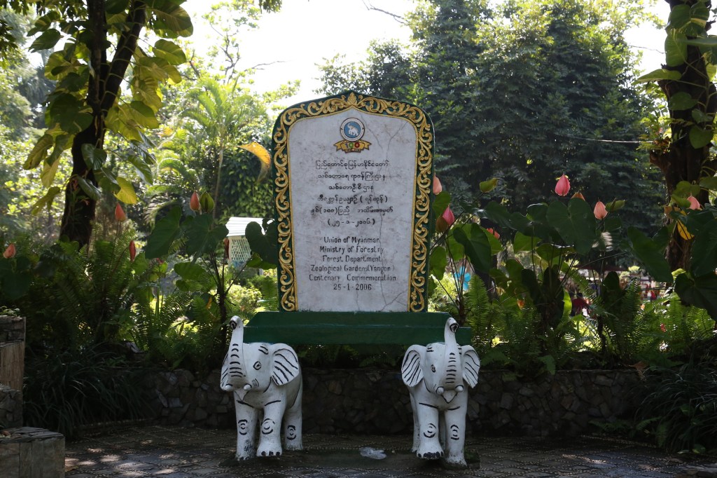 အဝင်ဝနားမှာသစ်တောရေးရာဝန်ကြီးဌာန၊ သစ်တောဦးစီးဌာနရဲ့ ၂၅-၁-၂၀၁၆ ရက်နေ့ တိရစ္ဆာန်ဥယျာဉ်(ရန်ကုန်)နှစ်တစ်ရာပြည့် အထိမ်းအမှတ်ကျောက်စာတိုင်ကိုတွေ့ တယ်။ သစ် တော ရေးရာ ဝန်ကြီးဌာနလို့ခေါင်းစဉ်တပ်ထားပေမယ့် နှစ်တရာပြည့် တဲ့အချိန်မှာ တိရစ္ဆာန် ဥယျာဉ်က သစ် တော ရေးရာဝန်ကြီးဌာနရဲ့ စီမံခန့်ခွဲမှုအောက်မှာ မရှိပါဘူး။ ၂၀၁၀ ထဲက ထူးကုမ္ပဏီအုပ်စု က ငှားရမ်းပြီး စီမံခန့်ခွဲနေတာပါ။