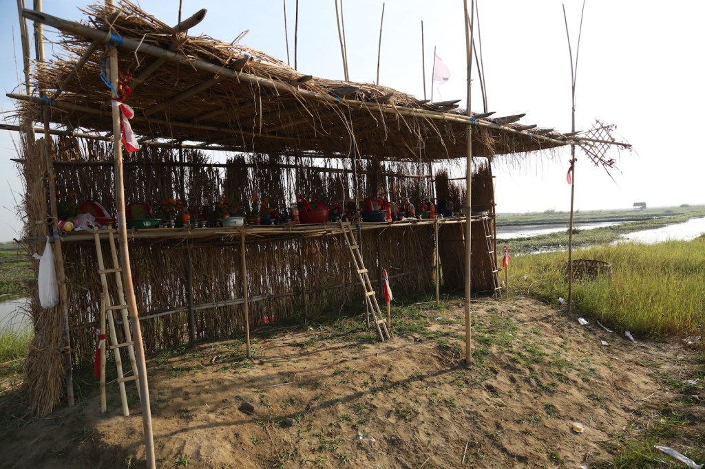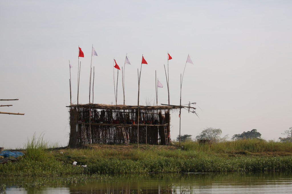 တဲဘေးမှာ နတ်စင်ကြိးတစ်ခုရှိတယ်။ ရှန်ပန်းဖြူ/နီတွေချည်ထားတယ်။ ကန်တော့ပွဲ၁၃ ပွဲ ထဲမှာ ကျွန်တော် ကတော့ ကိုကြီးကျော်၊ နန်ကရိုင်းမယ်တော်၊ မနှဲလေးပဲသိတယ်။ နတ်စင်ရှေ့ ရေစပ်မှာ နောက် ထပ်ကန်တော့ပွဲနှစ်ပွဲရှိတယ်။ အဲဒါကတော့ အင်းစောင့်နတ်တွေကို တင်ထားတာ။ သူတို့အခေါ် ရေပွဲပေါ့။