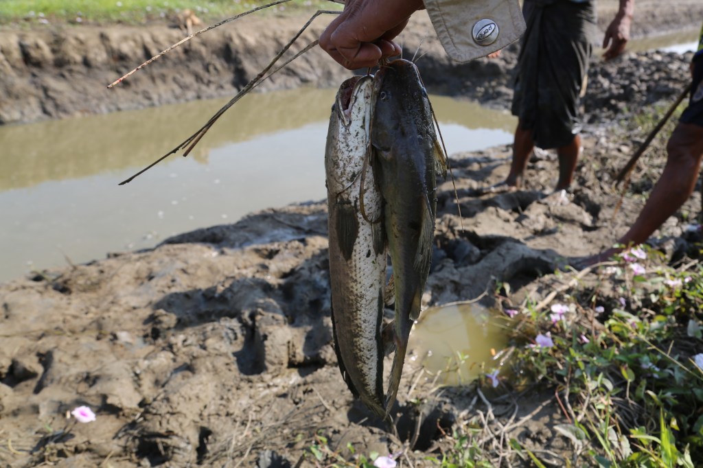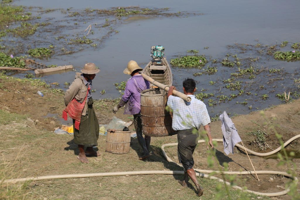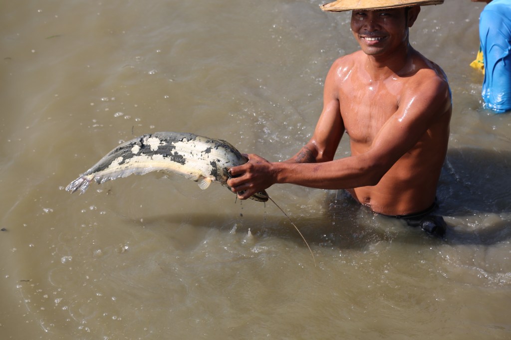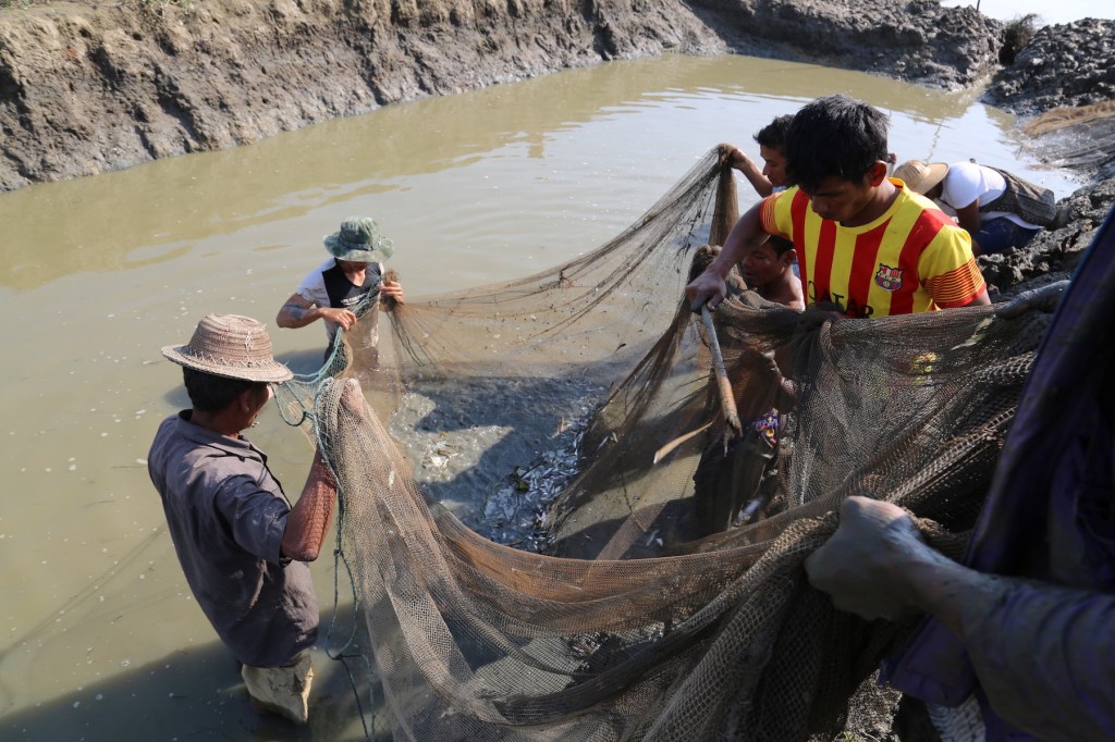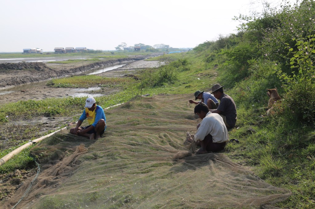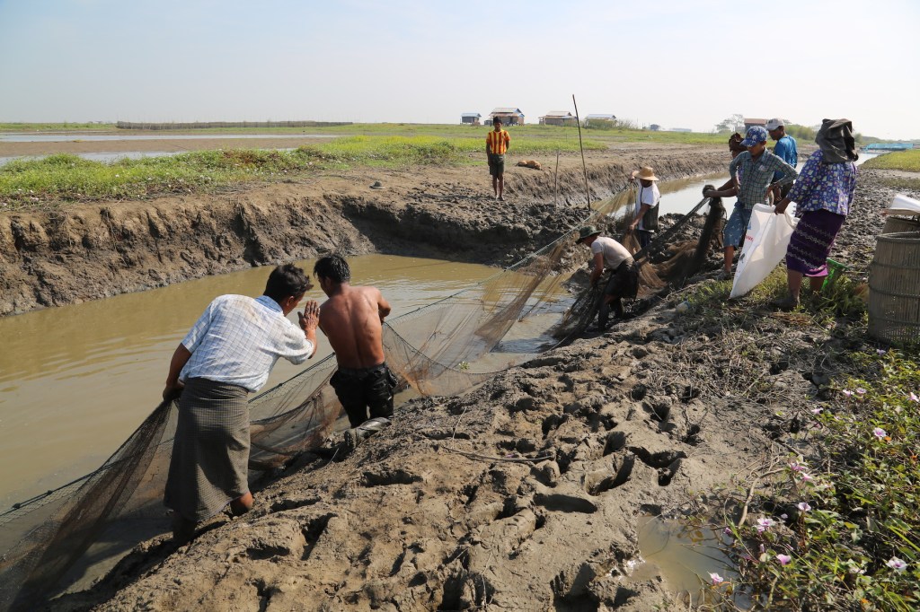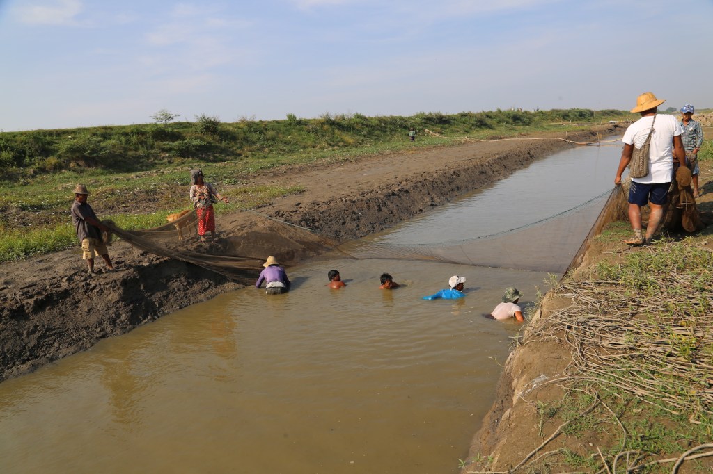 အင်းသားကြီးတို့က ရေစုတ်ထားတဲ့အကန့်မှာ ပိုက်ဆွဲဖို့ပြင်နေပြီ။ သူတို့အင်းချောင်းရဲ့ ဒီအပိုင်းက တာဘောင် ပြင်တဲ့အချိန်မှာ ဘက်ဟိုးတူးထားလို့ မြောင်းဖြစ်နေ တယ်။ အောက်မှာလည်း စမ်းပေါက်ပြီးရေလိုက်နေလို့ ရေကုန်အောင်အတော်အချိန်ယူရတယ်။ ဒီနေ့ကတော့ ပိုက်ဆွဲမယ်၊ နောက်နေ့ ရေခန်းသွားရင် ကျန်တဲ့ငါးတွေကို ထပ်ဖမ်းမယ်လို့ အင်းသားကြီးက ရှင်းပြတယ်။