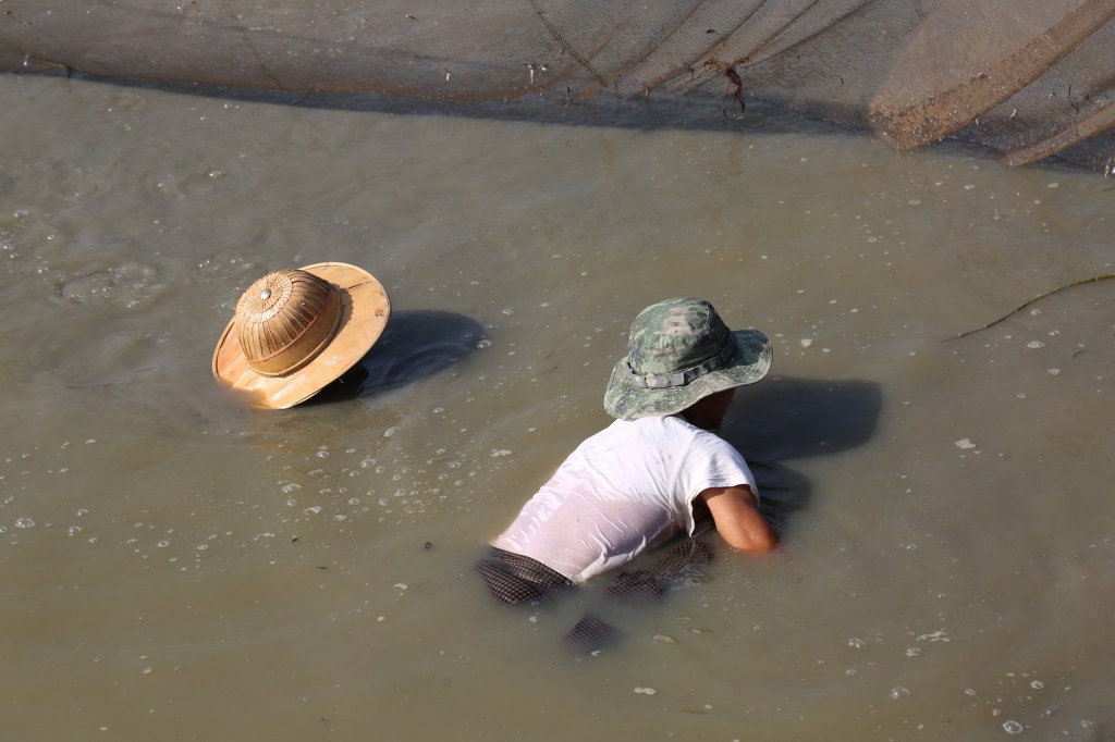 အင်းချောင်းထဲမှာ ရေကတော့ မနက်ဘူး။ ဒါပေမယ့် နွံတွေက ပေါင်လည်လောက်အထိ ရှိတယ်။ ကမ်းပေါ်က လူတွေကပိုက်ကို ဖြေးဖြေးလေးဆွဲသွားချိန်မှာ ရေထဲမှာ ရှိတဲ့လူတွေက ပိုက်အောက် နားစတွေကို ဖိထားကြတယ်။ ပိုက်ကိုတိုးပြီးထွက်ဖို့ ကြိုးစားတဲ့ ငါးရှိရင် ရေငုတ်ပြီး စမ်းတယ်။ မိရင် ဖမ်းပြီး ကမ်းပေါ် ပစ်တင်ပေးတယ်။