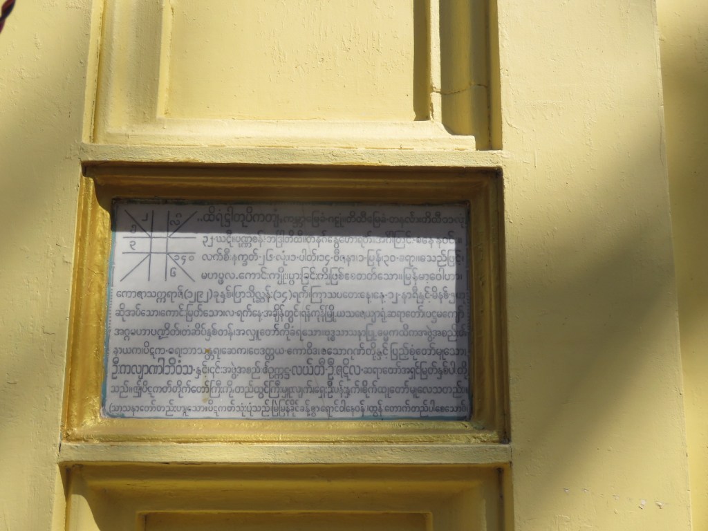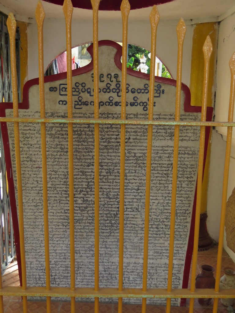 အဝင်၀ မုခ်ဦးမှာ “ ဦးကျော်ထွန်း ဥက္ကဋ္ဌ၊ သမ္မာသမ္ဗုဒ္ဓဘာသာ ကရင်လူမျိုး စာကြည့် ပိဋကတ်တိုက်” လို့ ရေးထားတယ်။ အဝင်၀ ညာဘက်မှာ ပိဋကတ်တိုက် တည်ဆောက်ရတဲ့ သမိုင်း ကို ရေးထိုးထားတဲ့ ကျောက်စာရှိတယ်။ ကျောက်စာရေးထိုးတဲ့ နှစ်က ကောဇာက္ကရာဇ် ၁၂၉ ၇ ခုနှစ်။ ကျောက်စာတိုက်ကို သံပန်းနဲ့ သေသေချာချာ ကာထားတယ်။ တိုက်နံရံမှာ တော့ ကောဇာသက္ကရာဇ် ၁၂၉ ၂ ခုနှစ်၊ ပြာသိုလဆန်း ၁၄ ရက်၊ နေ့ ၁၂ နာရီ ၅ မိနစ်မှာ ရှေးဦး ပန္နက် စိုက်ထူတဲ့အကြောင်း ဂြိုလ်ခွင်နဲ့တကွ တိတိကျကျ ရေးသားထားတဲ့ကျောက်ပြားတစ်ချပ် ကပ်ထားတယ်။