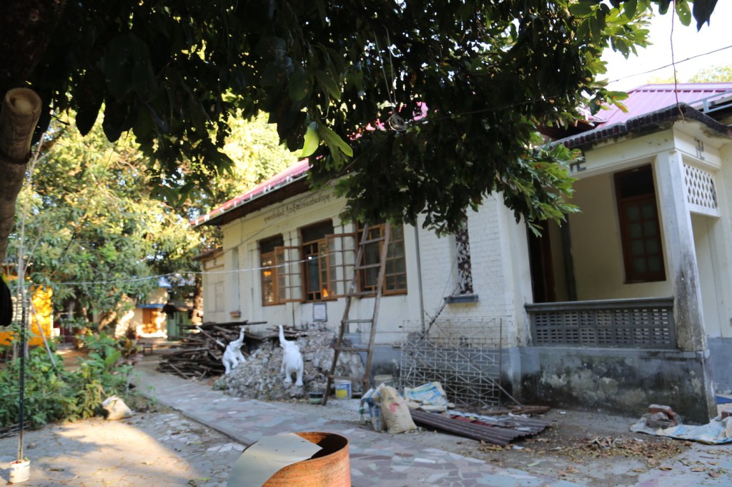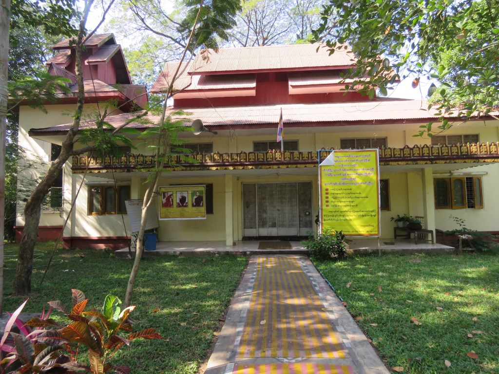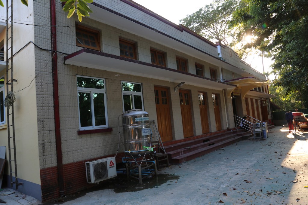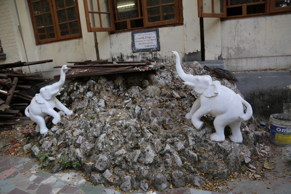 ပထမကျောင်းတိုက်ရှေ့နံရံနဲ့ကပ်လျက်နေရာမှာ ထုံးဖြူသုတ်ထားတဲ့ ကျောက်ပုံတစ်ခု ရှိတယ်။ ကျောက်ပုံ ဘယ်ညာမှာ ဆင်ရုပ်နှစ်ခုရှိတယ်။ နောက်ဘက်ကျောင်းနံရံမှာတော့ “ ဆင်နှစ်ကောင် အမှတ်အသားနေရာသည် ရန်ကုန်ဆရာတော်ကြီး ဦးဝိသုဒ္ဓ ဝိပဿနာ သတိပဋ္ဌာန် တရားများ စတင် ဟောကြားခဲ့သည့် အထိမ်းအမှတ် ပလ္လင်နေရာဖြစ်ပါသည်။ ရိုသေမှုဖြင့် ကုသိုလ်ယူပါ။” လို့ ရေးထားတဲ့ကျောက်ပြားတစ်ချပ် ရှိတယ်။ ဒါပေမယ့် ကျောက်ပုံပေါ်မှာ သွပ်ပြား အဟောင်း တွေပုံထားတယ်။ ကျောင်းပြင်နေဆဲ ကာလဖြစ်လို့ထင်ပါတယ်။ ဒီအဆောက်အဦ နှစ်ခုက မူလ ပထမအဆောက်အဦတွေပါ။ အခုတော့ ကျောင်းဝင်းထဲမှာ ကျောင်းတိုက် အသေးလေးတွေ အများ ကြီးဖြစ်နေပြီ။ နောက်ဘက်မှာလည်း နှစ်ထပ်ဆောင်တစ်ခု တိုးချဲ့ဆောက်နေတယ်။ ရွှေတိဂုံစေတီ တော် ဝတ္တကမြေထဲမှာ နောက်ထပ်အဆောက်အဦသစ်တွေ တိုးချဲ့ဆောက်တာနဲ့ပတ်သက်ရင် တိကျတဲ့ မူဝါဒတစ်ခုရှိသင့်ပြီလို့ ခံစားမိတယ်။