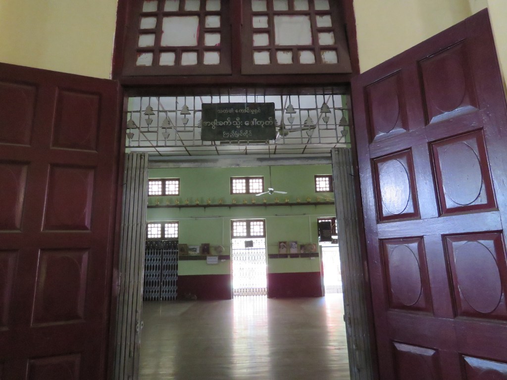 ဇရပ်အတွင်းကတော့ ခန်းမကျယ်ကြီးပါပဲ။ နောက်ဘက်တံခါးအဝင်မှာ “ သံတံခါး ကောင်းမှုရှင် အဖွါးခက် သ္မီးဒေါ်တုတ် ကြည့်မြင်တိုင်” လို့ရေးထားတဲ့ဆိုင်းဘုတ်ရှိတယ်။ ဇရပ်အတွင်းပိုင်းမှာ ထူးခြားတာက ဓမ္မာရုံအများစုမှာ တွေ့ရတဲ့ ဘုရားစင်နေရာကို နှစ်ထပ်လုပ်ထားတယ်။ အောက် ထပ်က တရားဟော ပလ္လင်ရှိပြီး အပေါ် ထပ်က ဘုရားစင်လုပ်ထားတယ်။ ဆရာတော်တွေ တရား ပေးတဲ့အခါ ဘုရားစင်ကို ကွယ်မနေတော့ဘူးပေါ့။ ဒီပုံစံကို အောက်ပစ္စယံ အောင်ခြင်း ပဋိကတ်တိုက်ဓမ္မာရုံမှာလည်းတွေ့ခဲ့ရတယ်။ ဘုရားစင်နဲ့ တစ်တန်းတည်း နံရံတစ်လေ ျှာက်မှာ ရပ်တော်မူပုံတော်တွေရှိတယ်။ အဘွားခက် လှုဒါန်းခဲ့တဲ့ ဘုရားရှစ်ကျိပ်သုံးဆူဆိုတာ ဒီရုပ်ပွားတော် တွေကို ဆိုလိုတာပါ။ အခုတော့ နောက်လူတွေက ပြုပြင်မွမ်းမံထားပြီး စုစုပေါင်း ၁၀၄ ဆူရှိနေပြီ။ ဓမ္မာရုံထဲမှာ ဟိုးရှေးထဲက ရှိခဲ့တဲ့ ဥပုသ်သည်တွေခေါင်းအုံးတဲ့ သစ်သားခေါင်းအုံးတွေရှိသေးတယ်။