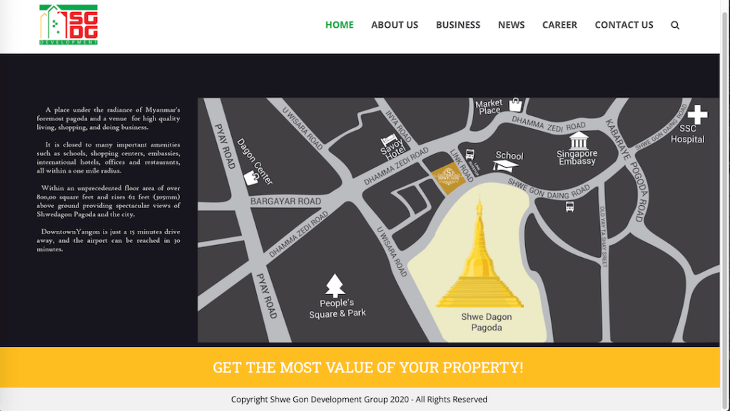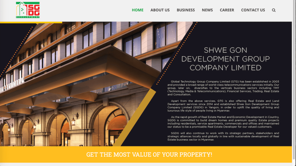 သူတို့ဝက်ဘ်ဆိုက်မှာပဲ Shwe Gon Development Group, SGDG ဆိုတာဟာ Global Technology Group Company Limited (GTG) က ၂၀၁၄ ခုနှစ်မှာတည်ထောင်ခဲ့တဲ့လုပ်ငန်းခွဲဖြစ်တယ်၊ GTG က ၂၀၀၃ ခုနှစ်က စတင်ပြီး သတင်းအချက်အလည်နည်းပညာဆိုင်ရာလုပ်ငန်းတွေကို လုပ်ဆောင်ခဲ့တယ်လို့ ဖော်ပြထားပါ တယ်။ ပုံ ၂