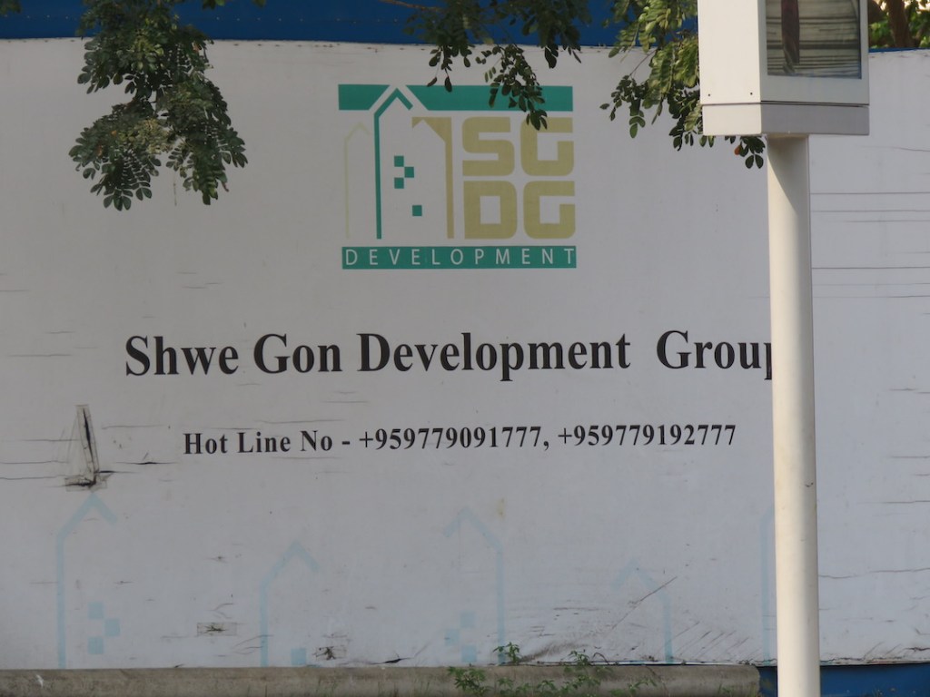 အရင်က အဲဒီနေရာက တပ်မတော်ပိုင်မြေနေရာပဲ၊ အခုတော့ “ Shwe Gon Development Group” “ Hotline No. +959779091777 , +959779192777” လို့ရေးထားတယ်။ အထဲ မှာ ဘာတွေလုပ်နေလဲဆိုတာတော့ မမြင်ရဘူး။