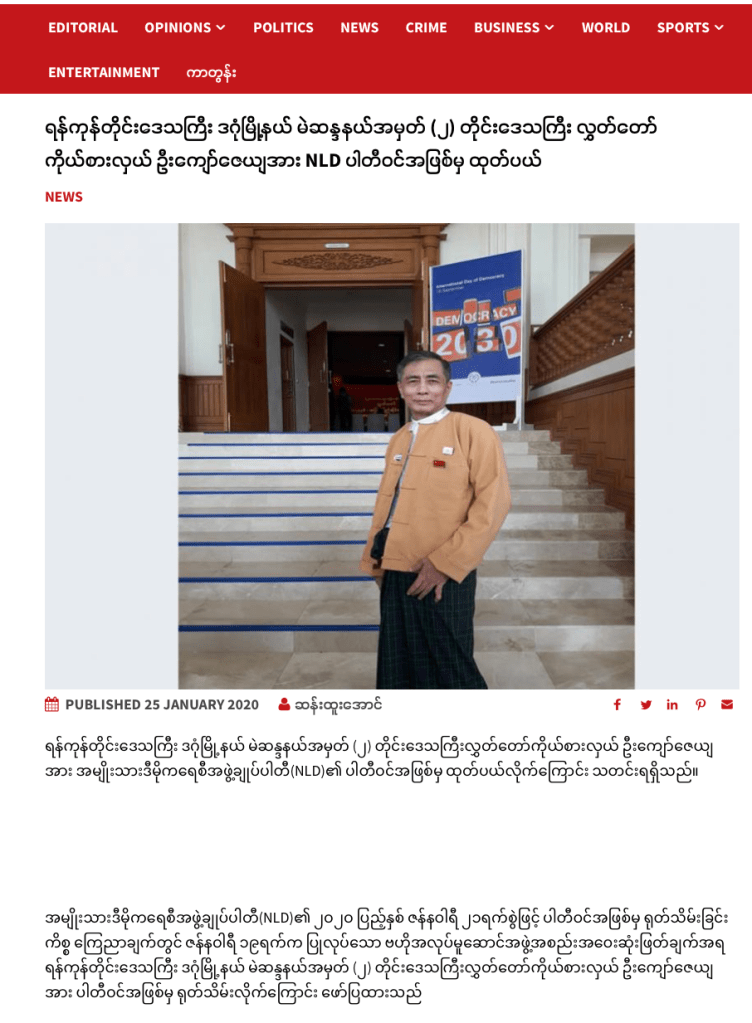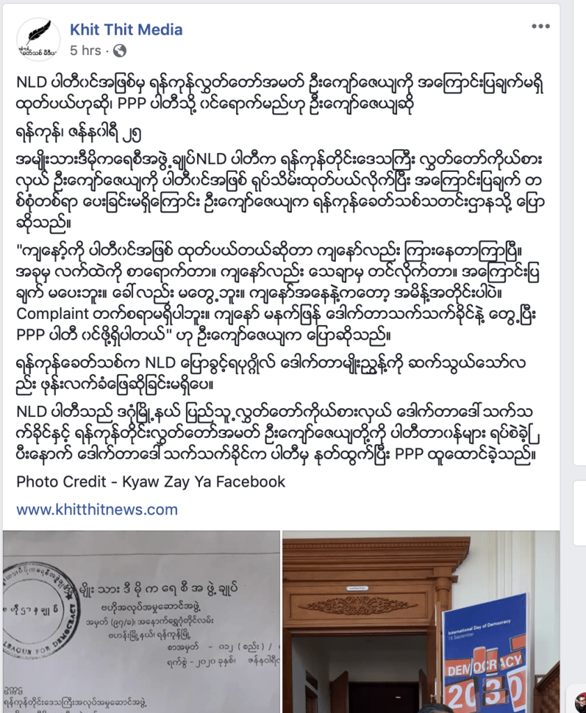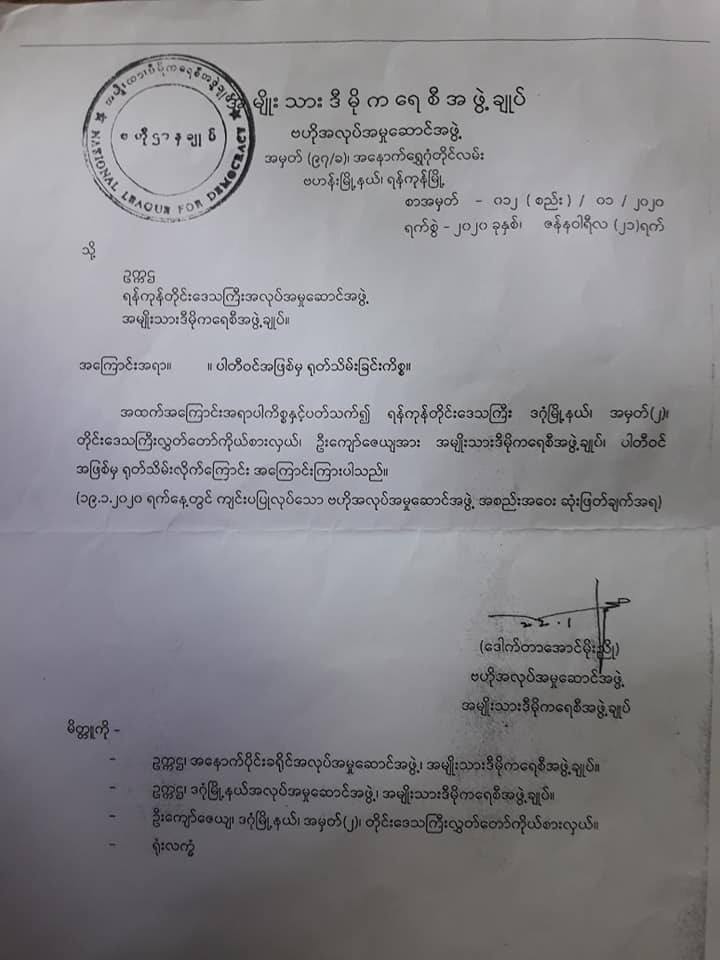 အင်န်အယ်လ်ဒီပါတီ ဗဟိုအလုပ်မှုဆောင်ကော်မတီက ရန်ကုန်တိုင်းဒေသကြီး ဒဂုံမြို့နယ် အမှတ် (၂) တိုင်းဒေသကြီးလွှတ်တော်ကိုယ်စားလှယ် ဦးကျော်ဇေယျကို ပါတီဝင်အဖြစ်က ရုပ်သိမ်း ကြောင်း ဒေါက်တာအောင်မိုးညိုလက်မှတ်နဲ့ ဇန်နဝါရီလ ၂၁ ရက်နေ့မှာ ထုတ်ပြန်ခဲ့တယ်။ ပုံ ၁ နဲ့ ၂