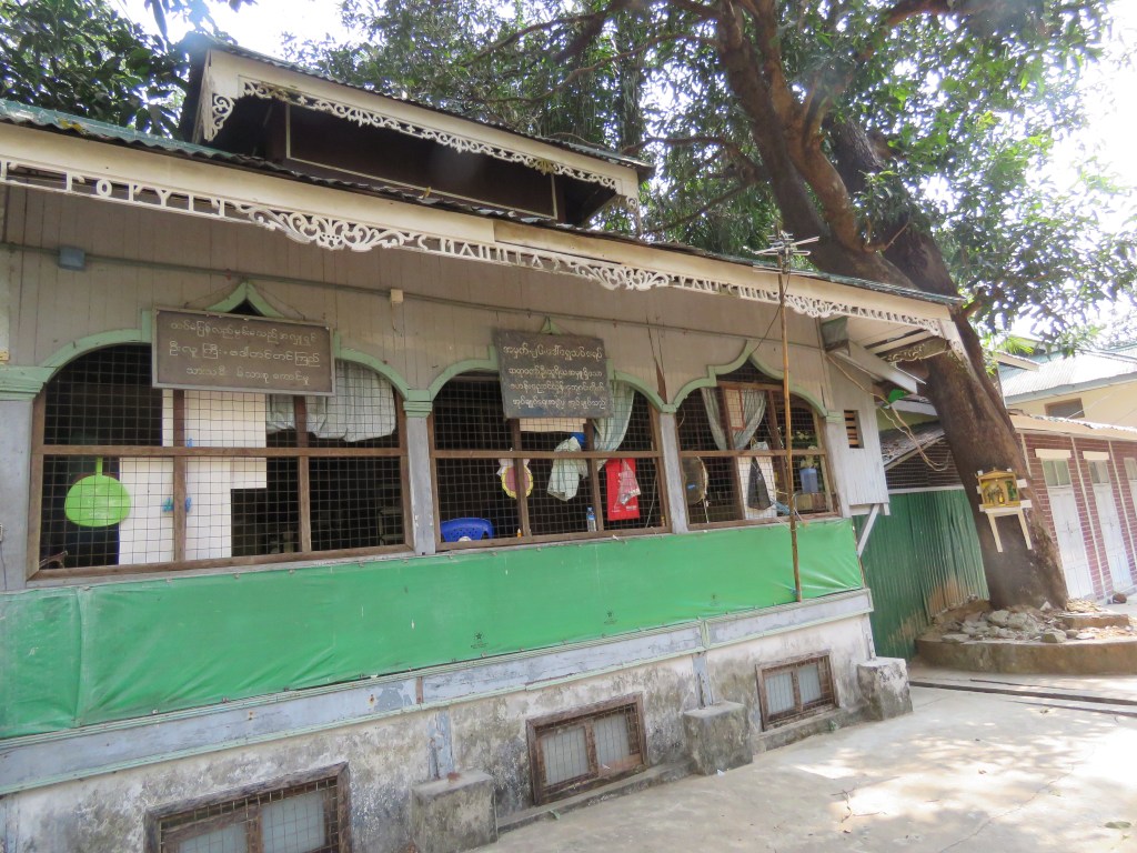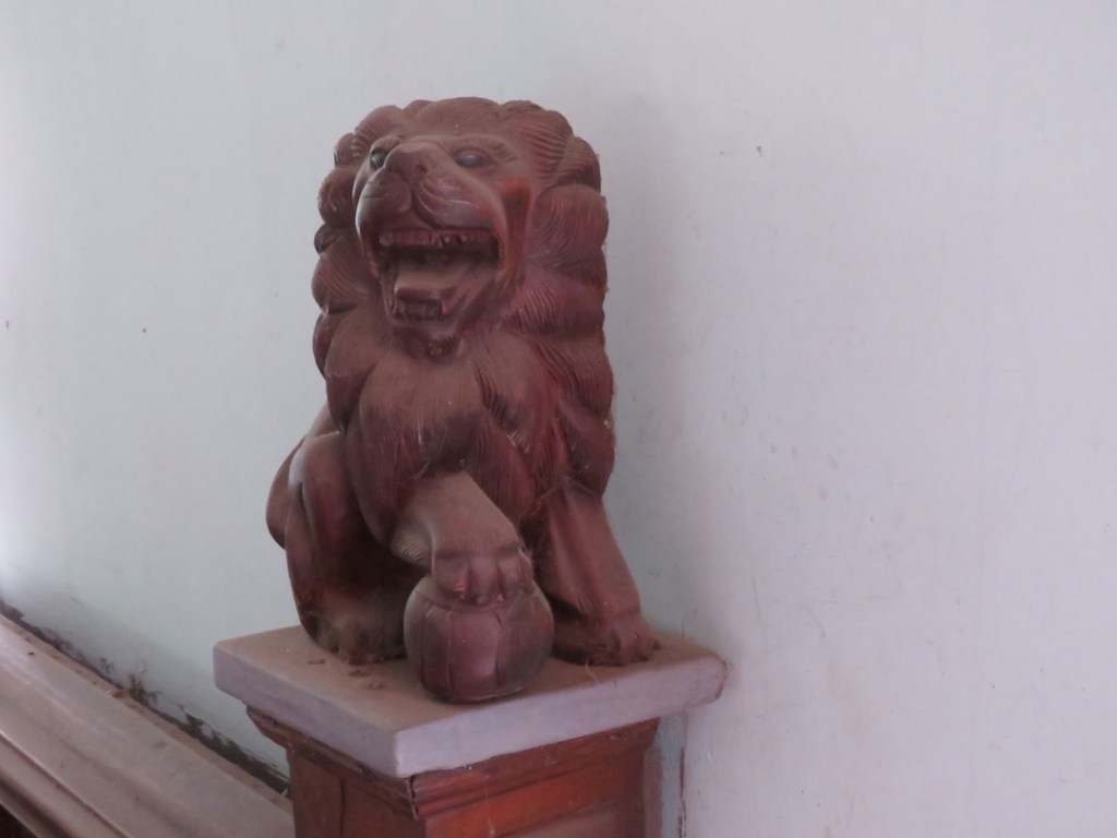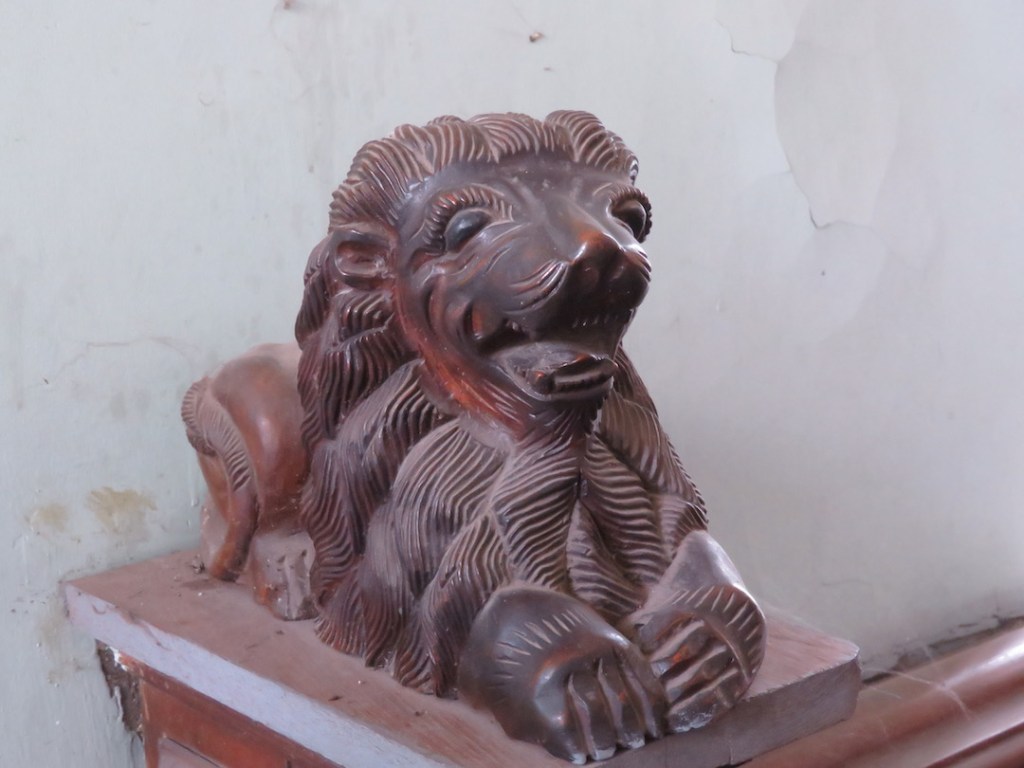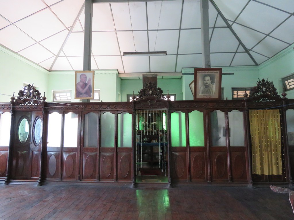 အပေါ်ထပ်မှာ အထူးခြားဆုံးကတော့ ဘုရားခန်းကို ကာထားတဲ့ သစ်သားနံံရံပေါ်က ပန်းပုလက်ရာ တွေပါပဲ။ ဝင်ပေါက်သုံးပေါက်ရဲ့ အပေါ်မှာ ခြင်္သေ့ နဲ့ မြင်း ကို သုံးပြီး Coat of Arms ပုံစံဖော် ထား တယ်။ အလယ်က ဘဲဥပုံနေရာမှာ မြန်မာအမျိုးသားကြီး တစ်ဦးထိုင်နေတဲ့ ဓာတ်ပုံကို ထည့်ထား တယ်။