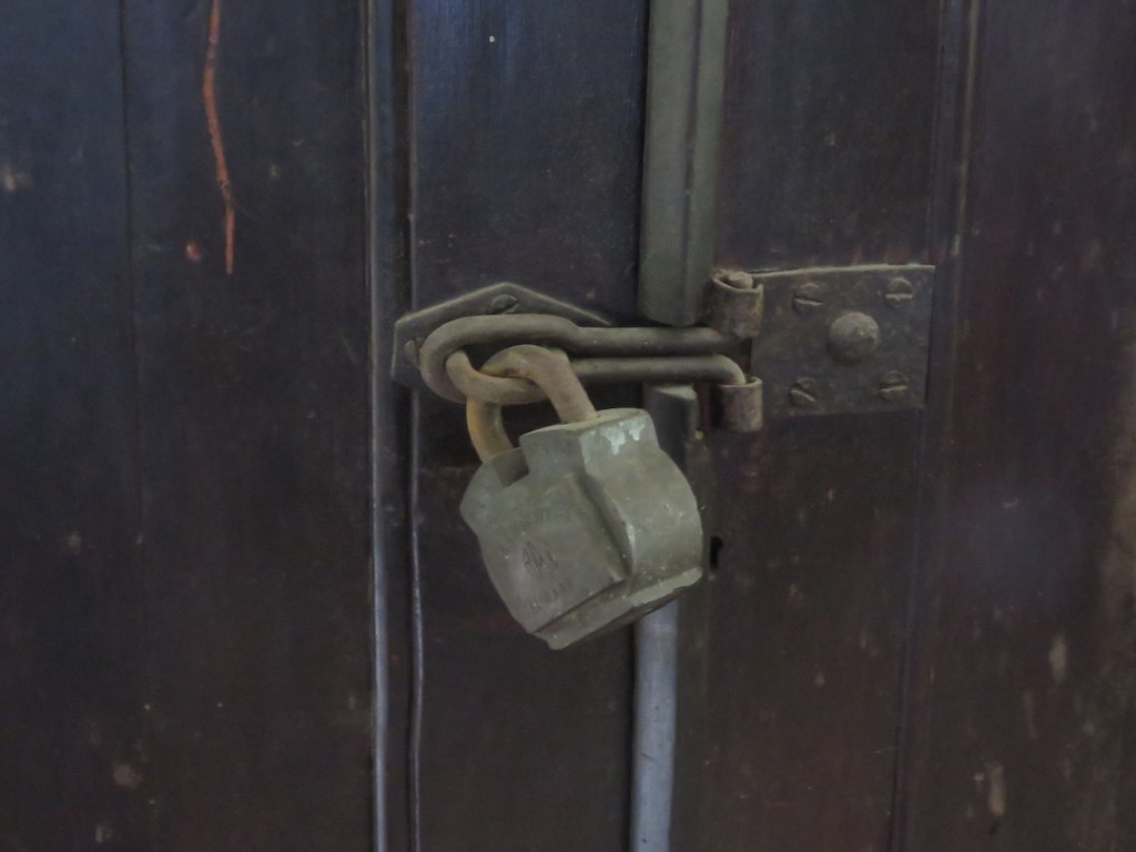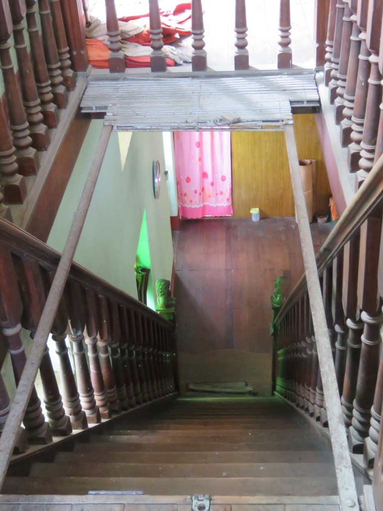 အပေါ်ထပ်ကို တက်တဲ့လှေ ကားမှာ သံဘာဂျာတခါးကို ကြမ်းပြင်အတိုင်း အလျားလိုက်တပ် ထား တယ်။ အပေါ်ထပ်ကနေ ဆွဲပိတ်ပြီးသော့ခတ်လိုက်ရင် အောက် လူတက်လို့ မရတော့ဘူးပေါ့။ စစ်အတွင်းနယ်မြေမအေးချမ်းတဲ့အချိန်ကများ တပ်ဆင် ထားသလားလို့ တွေးမိတယ်။ အညာ ဘက်က ခြေတံရှည်အိမ်တွေမှာလည်း နယ်မြေမအေးချမ်းချိန်က ဓားပြ ရန် ကာကွယ်ဖို့အတွက် အဲဒီပုံစံမျိုး သစ်သား နဲ့ အပိတ်အဖွင့်လုပ်တာမျိုးတွေ့ဖူးတယ်။ လှေခါး အတက်၊ အဆင်း လက်ရန်းတိုင်ထိပ်တွေက ခြင်္သေ့ရုပ်တွေကတော့ တရုတ်လက်ရာတွေပဲ။