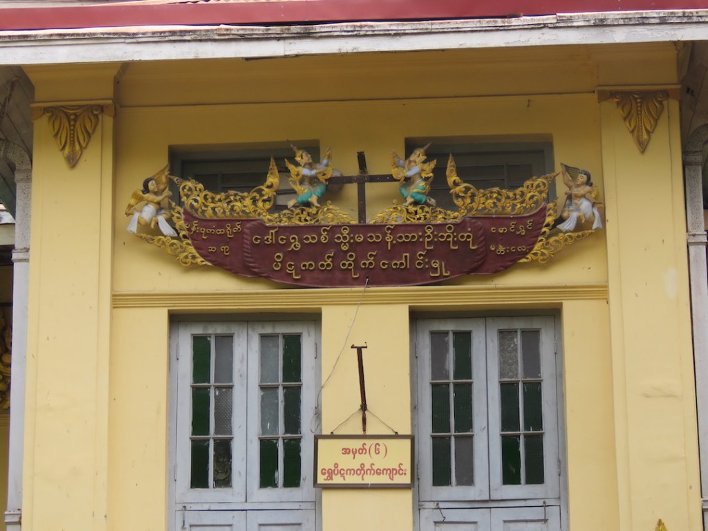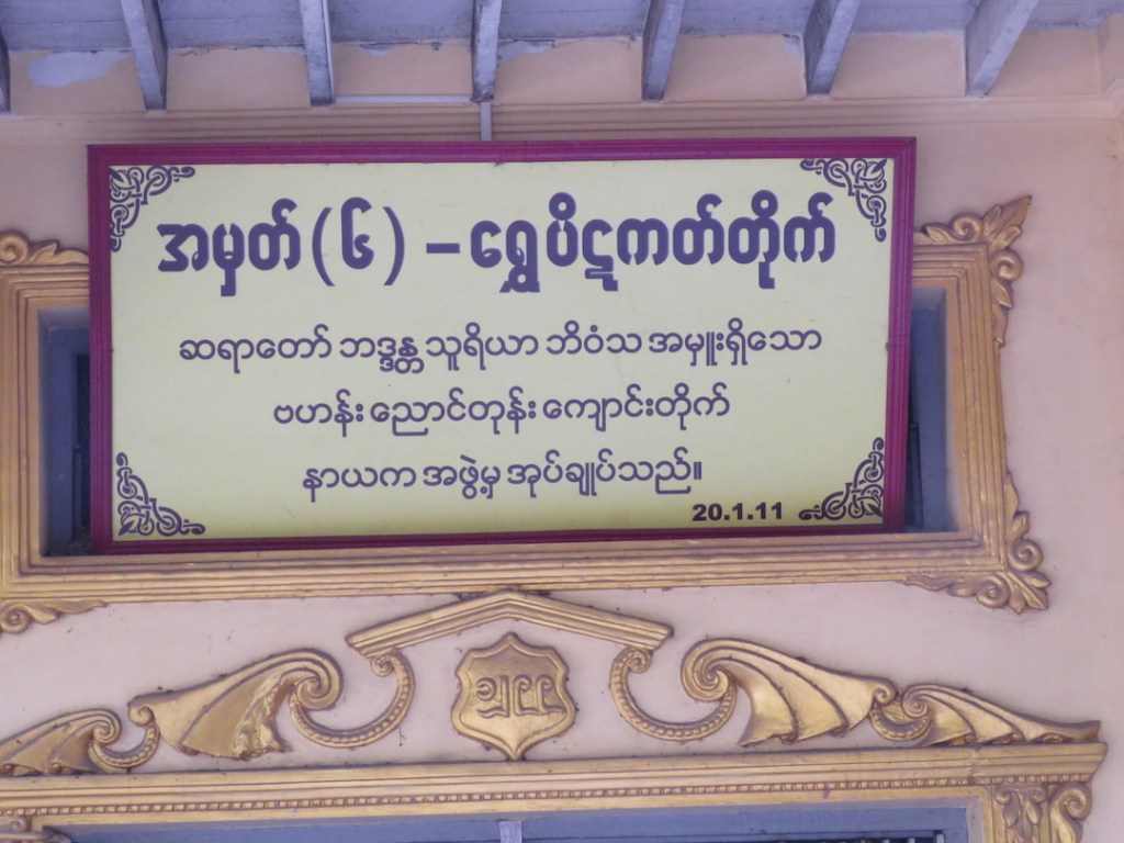 တိုက်မျက်နှာစာမှာ အလှုရှင်အမည်ကို ရေးထားတဲ့ ကနုတ်ပန်းဆိုင်းဘုတ်တစ်ခုရှိတယ်။ ဒီဆိုင်း ဘုတ်မှာ ထူးခြားချက်နှစ်ခုတွေ့တယ်။