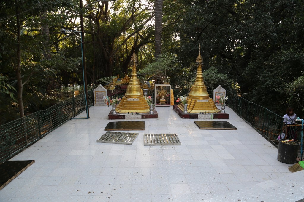 တောင်ဘက်စောင်းတန်းကနေ အောက်ပစ္စယံလူသွားလမ်းလေးအတိုင်းသွားမယ်ဆိုရင် “ မူလ မင်းကွန်း ဝိပဿနာ ကမ္မဋ္ဌာန်းဌာန” နဲ့ မောင်ဝိတ်ဓမ္မာရုံကြားမှာ “ ရန်ကုန် ဘိုးဘိုးကြီး သို့” လို့ ရေးထားတဲ့ဆိုင်းဘုတ်တစ်ခုရှိတယ်။ အဲဒီလမ်းလေးအတိုင်းသွားတဲ့အခါ ကျောက်ပြား အဖြူ တွေ ခင်းထားတဲ့ ရင်ပြင်နဲ့ စေတီငယ်လေးနှစ်ဆူရှိတယ်။ ဒီနေရာဟာ ရွှေတိဂုံ ဘုရားရဲ့ စနေ ထောင့် နေရာ နဲ့ တစ်တန်းတည်းပဲ။