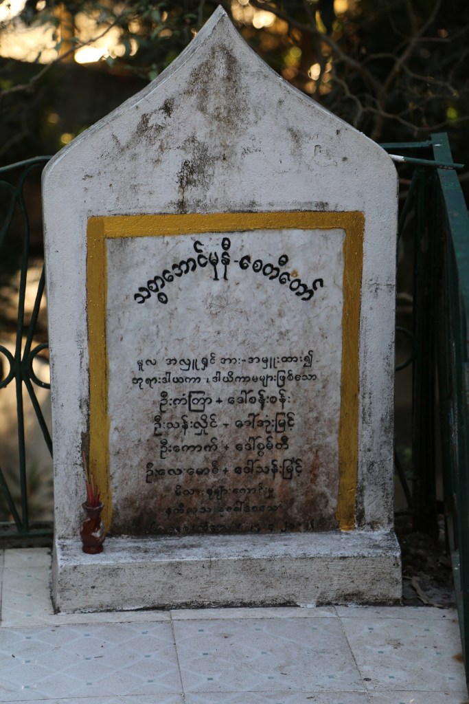ညာဘက်က စေတီမှာ “ သစ္စာအောင်မုနိစေတီတော်” မူလအလှုရှင်အား အမှူးထား၍ အစချီပြီး အလှုှရှင်မိသားစု လေးစုရဲ့ အမည်တွေကို ဖော်ပြထားတဲ့ ကျောက်စာတစ်ချပ်ရှိတယ်။ ထပ်မံပြုပြင် တဲ့ နှစ်ကိုတော့ ( ၂၅ – ၄ – ၂၀၀၂ ) လို့ဖော်ပြထားတယ်။