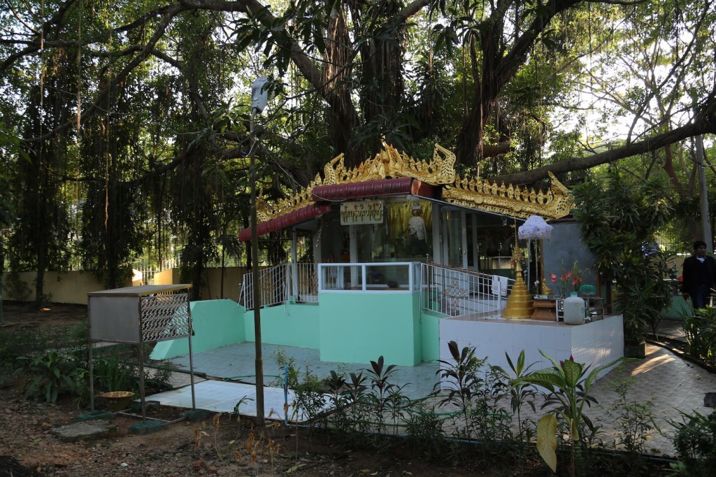 အဲဒီရင်ပြင်ဘေးမှာ လှေကားတစ်ခုရှိတယ်။ အဲဒီလှေကားအတိုင်းဆင်းသွားရင် ရန်ကုန် ဘိုးဘိုးကြီး နတ်နန်းကိုရောက်တယ်။ အုတ်လှေကားလေးက သပ်ရပ်တယ်။ လက်တန်းတွေနဲ့၊ အောက်ခြေ လမ်းလေးကလည်း ကွန်ကရစ်လမ်း။ လမ်းအဆုံးညောင်ပင်ကြီးအောက်မှာတော့ ရန်ကုန် ဘိုးဘိုး ကြီး နတ်နန်းရှိတယ်။