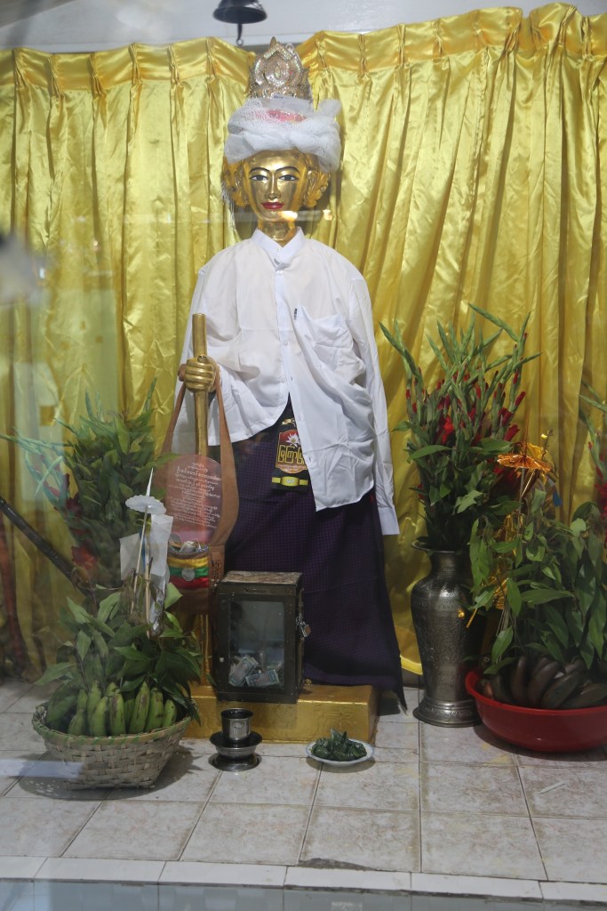 နတ်နန်းပုံစံက မြင်နေကြပုံစံမဟုတ်ဘူး။ အပေါ်ကို မြှင့်ထားတယ်။ ဘယ်ညာ လှေကားနှစ်ဘက်နဲ့ တက်/ ဆင်းလုပ်လို့ရတယ်။ ညာဘက်ဘေးမှာ သဲပုံစေတီပုံစံ စေတီငယ်တစ်ဆူကို အုတ်ခုံ အမြင့် မှာတည်ထားတယ်။ ရန်ကုန်ဘိုးဘိုးကြီးမျက်နှာတော်က ရွှေချထားတယ်။ ခေါင်းပေါင်းအဖြူ၊ လည် ကတုံးအကျီ ၤဖြူနဲ့မရမ်းစေ့ရောင်ရင့်ရင်ပုဆိုးတစ်ထည်ကပ်ထားတယ်။ ကန်တော့ပွဲ နှစ်ပွဲထိုးထား တာတွေ့တယ်။ နတ်ကွန်းရဲ့ဘေးမှာ နောက်ထပ် ဘုရား စင်လေးတစ်ခုရှိတယ်။ အဲဒီစင်ရှေ့မှာ လည် ကတုံးအကျီ ၤ၊ ပုဆိုး အမည်း၊ အဖြူ ကွက်စိတ်နဲ့လူငယ်လေးတစ်ယောက် ပဋ္ဌာန်းရွတ်နေ တယ်။ ဘုရားစင်မှာလည်း မီးပူဇော်ထားတယ်။