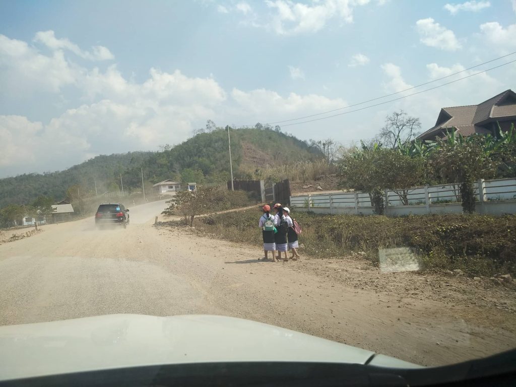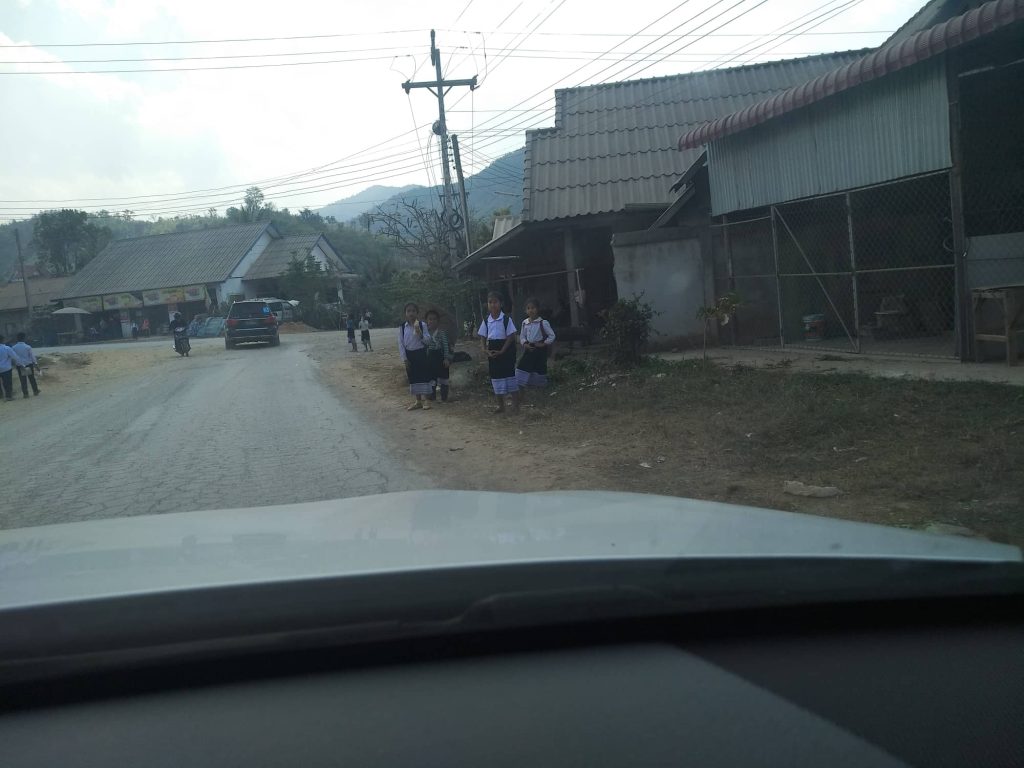 Hongsa မှာနေ့လည်စာစားတယ်။ စားသောက်ဆိုင်နာမည်က “ Hongsawadee” လို့ခေါ်တယ်။ ရုတ်တရက်ဆိုရင်တော့ “ ဟံသာဝတီ” လို့ ထင်ရတယ်။ တကယ်ကတော့ ဟောင်ဆာဝတီပါ။ စားသောက်ဆိုင်ရှေ့မှာ အလွန်ထူးခြားတဲ့ အိမ်ကြီးတစ်လုံးရှိတယ်။ အဲဒီအိမ်အကြောင်းကတော့ သီးခြားရေးပါ့မယ်။ ထမင်းစားပြီးပြန်ထွက်လာတော့ လမ်းဘေးမှာ ရွာတွေပိုများ လာတယ်။ မြန်မာပြည်ကရွာတွေမှာလိုပဲ ခြေလျင်သွားနေတဲ့ကျောင်းသားလေးတွေ တွေ့တယ်။ စက်ဘီးနဲ့ ဆိုင်ကယ်နဲ့ သွားသူလည်း ရှိတယ်။ ။ သူတို့ကျောင်းဝတ်စုံက အပေါ် အဖြူ၊ အောက်က အနက်။ ကျောင်းသားလေး တွေက ဘောင်းဘီအနက် ၊ ကျောင်းသူလေးတွေက လာအိုပုံစံလုံချည်အနက်မှာ အဖြူအနားနဲ့။ လွင်ပြင် ထဲမှာ ဆယ်ကီလိုမီတာလောက်သွားတော့ လမ်းကောင်းတဲ့ နေရာကိုရောက်တယ်။