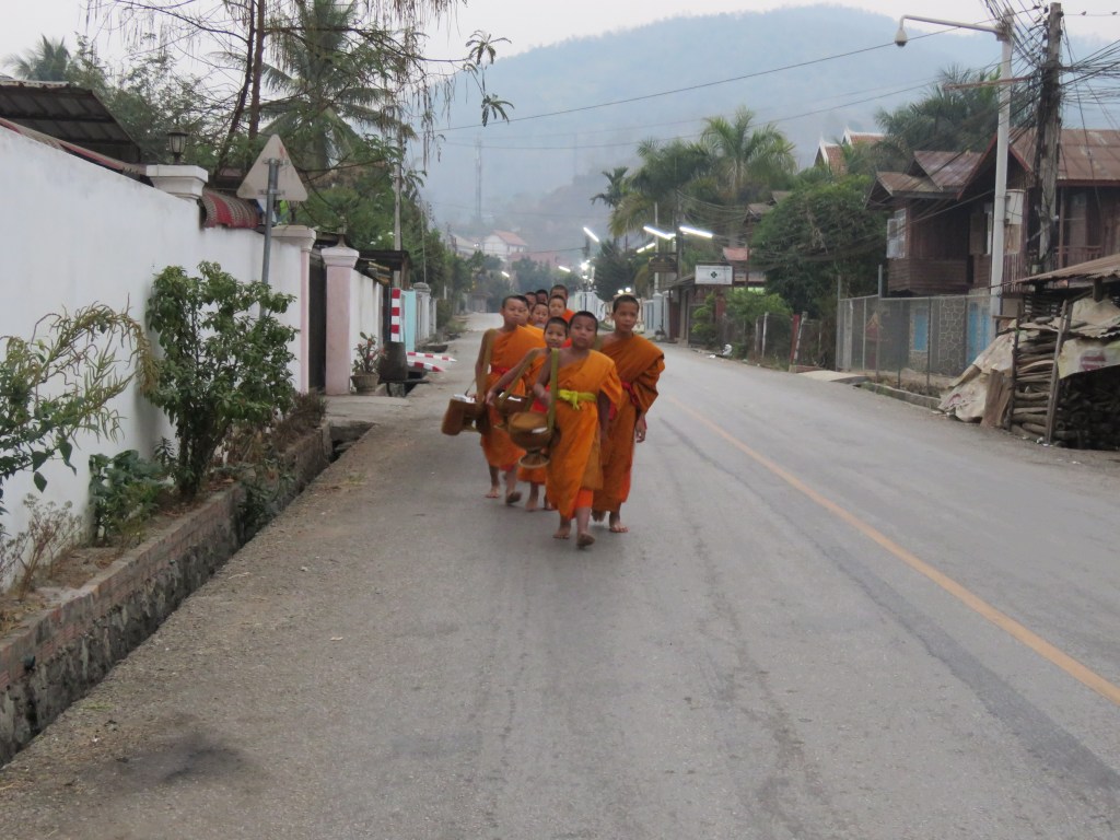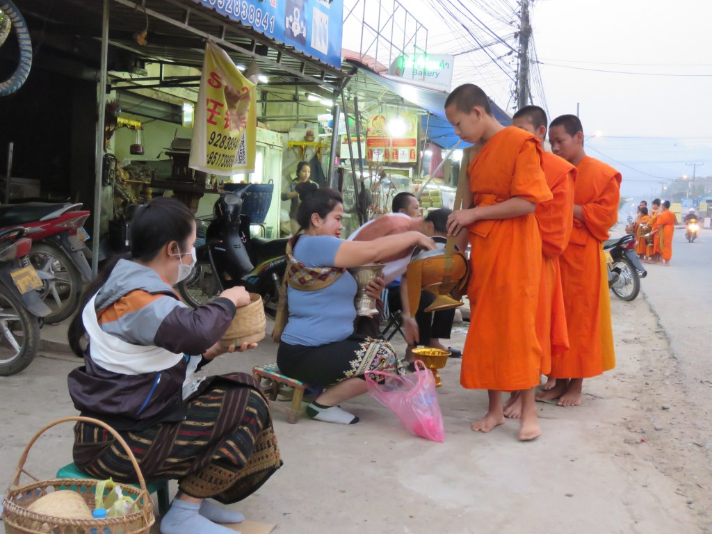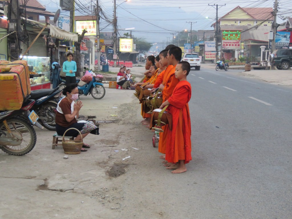 နောက်တစ်နေ့ မနက်စောစောမှာတော့ ဟိုတယ် နဲ့ မလှမ်းမကမ်းမှာ ရှိတဲ့ ရပ်ကွက်လေး ဘက် ကို ထွက်ခဲ့တယ်။ ကံကောင်းထောက်မစွာပဲ ကိုရင်လေးတွေ ဆွမ်းခံထွက်လာတာကို တွေ့ရ တယ်။ ဒကာမကြီးတွေက ထိုင်ခုံလေးတွေနဲ့ထိုင်ပြီး ကောက်ညှင်းဆွမ်းလောင်းတယ်။ ကိုရင် လေးတွေကလည်း တစ်ပါးချင်းရပ်ပြီး သပိတ်ကို အောက်နှိမ့်ပြီး အလှုခံတယ်။ အားလုံး ဆွမ်း ခံပြီးတော့ အလှုရှင်တွေရှေ့မှာ ရပ်ပြီး ဆုပေးတယ်။ ဒကာမတွေက ထိုင်လျက်နဲ့ ပဲ လက် အုပ်ချီပြီး နာယူတယ်။ အားလုံးပြီးတော့ ကိုရင်လေးတွေ နောက်တစ်နေရာကို ဆွမ်းခံကြွ သွား တယ်။