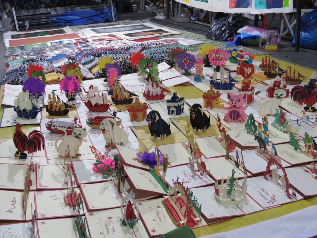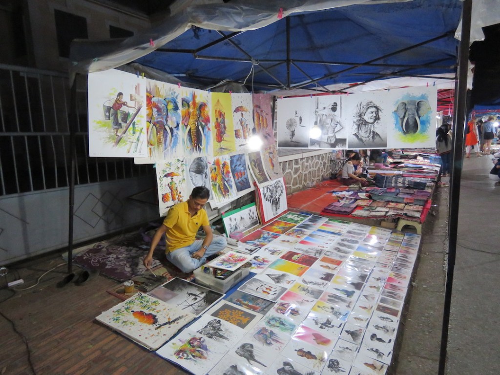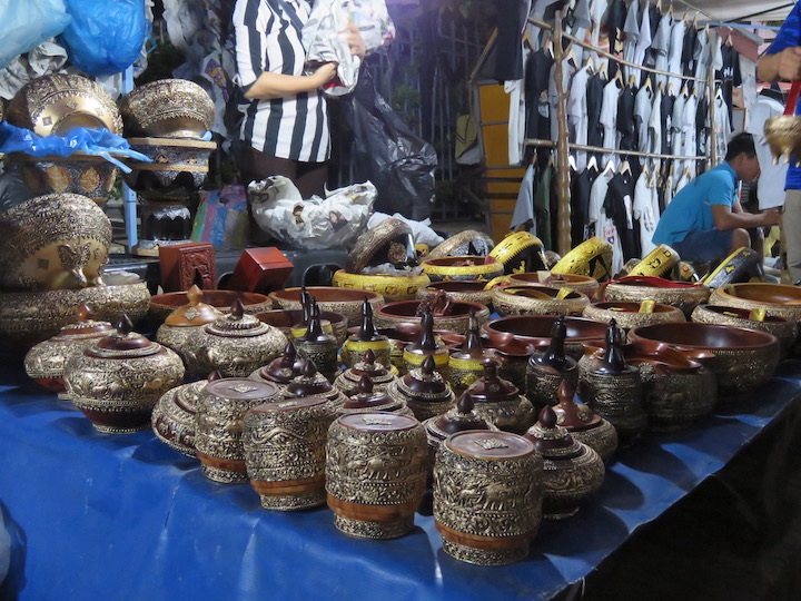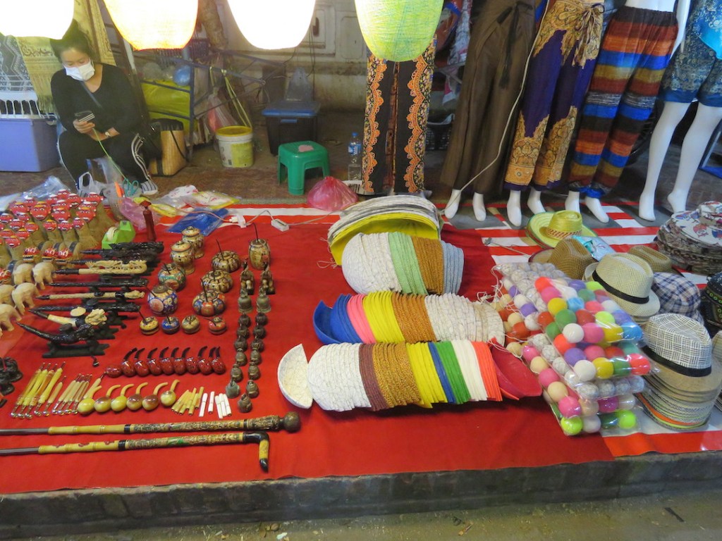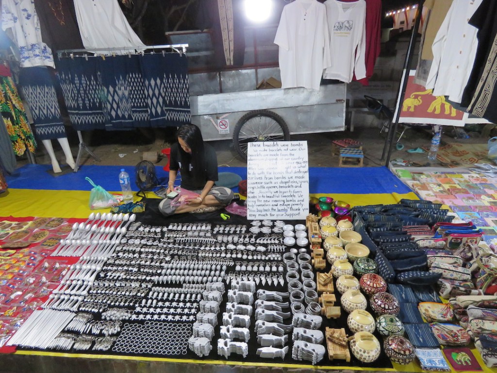 လက်မှုပစ္စည်းတွေက ဈေးအမျိုးမျိုးပဲ။ တစ်ချို့ အထည်စတွေက ပုံပြီးရောင်းနေပေမယ့် မေးလိုက် တဲ့အခါ မြန်မာငွေ တစ်သိန်းကျော်၊ နှစ်သိန်းလောက်တန်ဖိုးရှိတာတွေလည်းတွေ့တယ်။ တစ်နေ ရာမှာတော့ ဗီယက်နမ်စစ်ပွဲအတွင်းက လာအိုနိုင်ငံပေါ်မှာ ကြဲချခဲ့တဲ့ ဗုံးသီးတွေကနေ ပြုလုပ်ထား တယ်ဆိုတဲ့ သတ္တုထည်ပစ္စည်းတွေလည်းတွေ့ရတယ်။