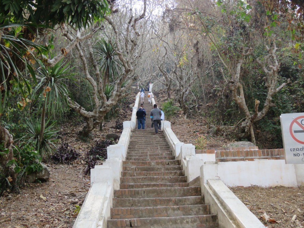ဒီတောင်ပေါ်ကို တက်တဲ့လမ်းနှစ်သွယ်ရှိတယ်။ ပထမတစ်ခုက ဘုရင့်နန်းတောင်ဟောင်းရှေ့ က တက်တဲ့လမ်းဖြစ်ပါတယ်။ နောက်တစ်လမ်းကတော့ တောင်တစ်ဘက် Thanon Phousi လမ်း ဘက်ကတက်တာ။ အဲဒီဘက်ကတက်ရင်တော့ မဲခေါင် မြစ်ဘက်က ရှုခင်းကိုကြည့်ပြီးတက်လို့ ရတယ်၊ လမ်းတစ်လေ ျှာက်မှာ စေတီငယ်တွေ၊ ဗုဒ္ဓရုပ်ပွားတော်တွေရှိတယ်။ တကယ်တော့ တစ်ဘက်က တက်ပြီး တစ်ဘက်က ပြန်ဆင်းတာအကောင်းဆုံးပဲ။ ကျွန်တော်တို့ကတော့ ခရီးသွားအေဂျင်စီက စီစဉ်တဲ့အတိုင်း နန်းတော်ဟောင်းဘက်က တက်၊ နန်းတောင်ဟောင်း ဘက်ကိုပဲ ပြန်ဆင်းခဲ့ရတော့ တောင်တစ်ဘက်က မြင်ကွင်းကို လေ့လာခွင့်မရခဲ့ဘူး။