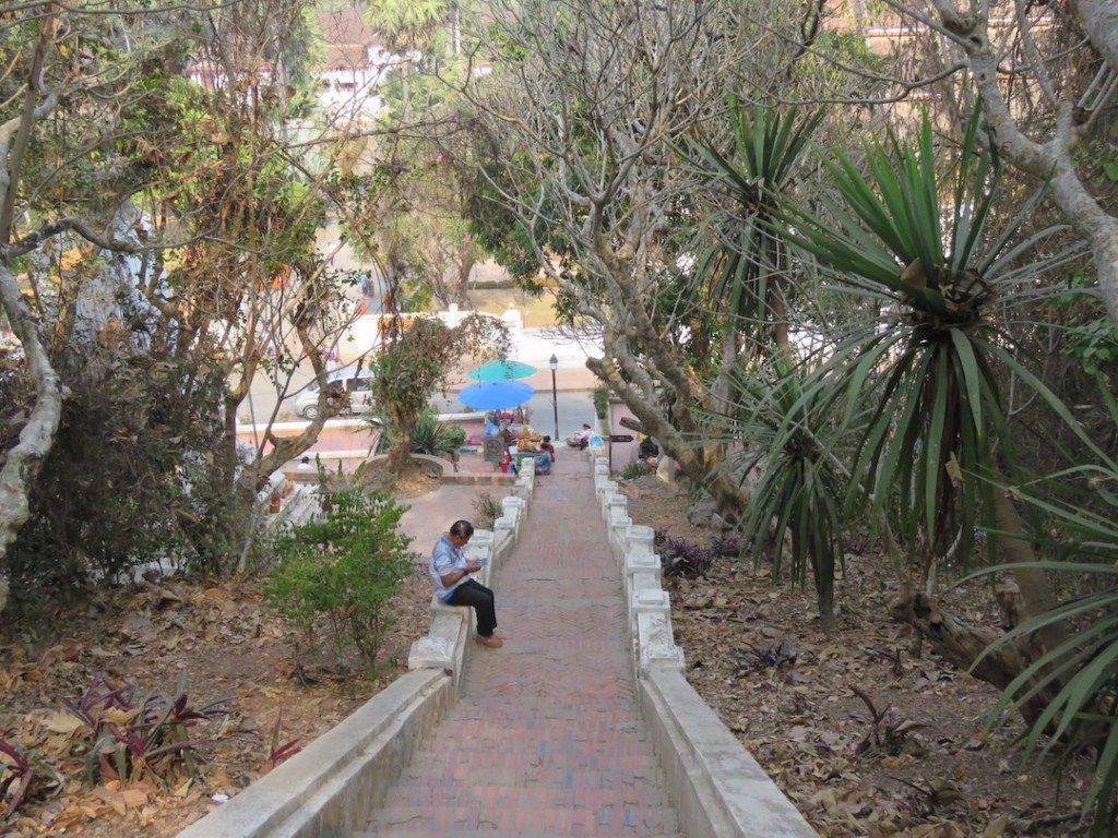တောင်စတက်တဲ့နေရာက နန်းတောင်ဟောင်းရှေ့၊ လွန်ပရာဘန်မြို့ရဲ့ အဓိကလမ်းမကြီး ဖြစ် တဲ့ Sisavangvong လမ်းမကြီးတစ်ဘက်က စတယ်။ လမ်းဘေးကနေ လှေကားငါးထစ်လောက် တက်လိုက်ရင် ရင်ပြည်ကျယ်တစ်ခုရှိတယ်။ အဲဒီနေရာမှာ လက်မှုပစ္စည်း၊ ရိုးရာမုန့်၊အအေး တွေ ရောင်းတယ်။ ဘေးမဲ့ငှက်တွေလွှတ်ဖို့ ရောင်းတာလည်း တွေ့တယ်။