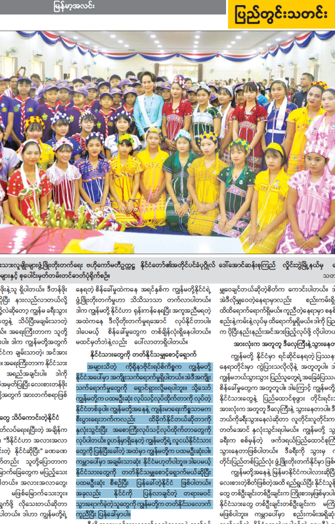 အဲဒီလို မှတ်သားတဲ့အခါ ဖေဖော်ဝါရီလ ၂၅ ရက်နေ့ လှိုင်းဘွဲ့မြို့နယ်၊ အောင်ဆန်းခန်းမ ဒေသခံပြည်သူများနှင့် တွေ့ဆုံချိန်မှာ အတိုင်ပင်ခံပုဂ္ဂိုလ် ဒေါ်အောင်ဆန်းစုကြည်က အခု လို ပြောကြားခဲ့တာကိုဖတ်ရတယ်။