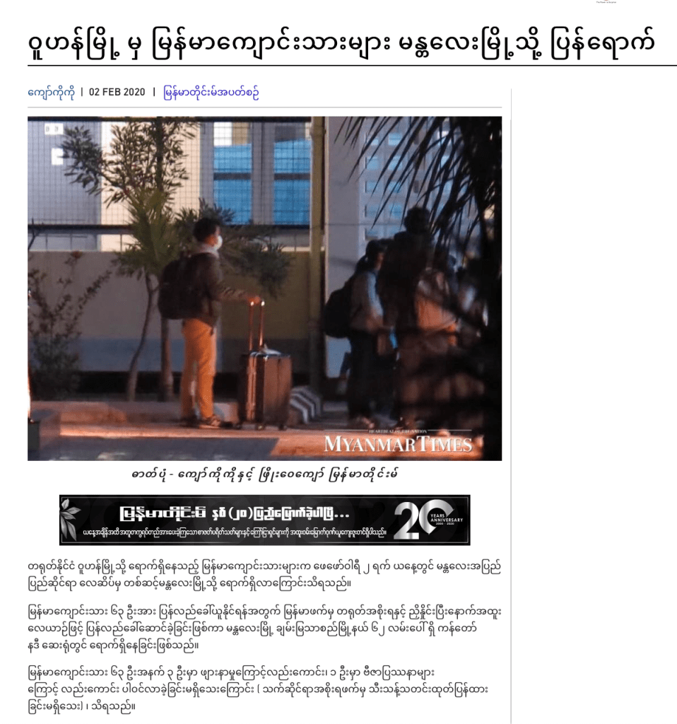 ဒီသတင်းသုံးပုဒ်ကို ကြည့်တာနဲ့တင် ဝူဟန်ကနေ ကိုယ့်နိုင်ငံသားတွေကို ပြန်ခေါ်ခဲ့တာ မြန်မာက ပထမဆုံးနိုင်ငံမဟုတ်ဘူးဆိုတာ ထင်ရှားပါတယ်။