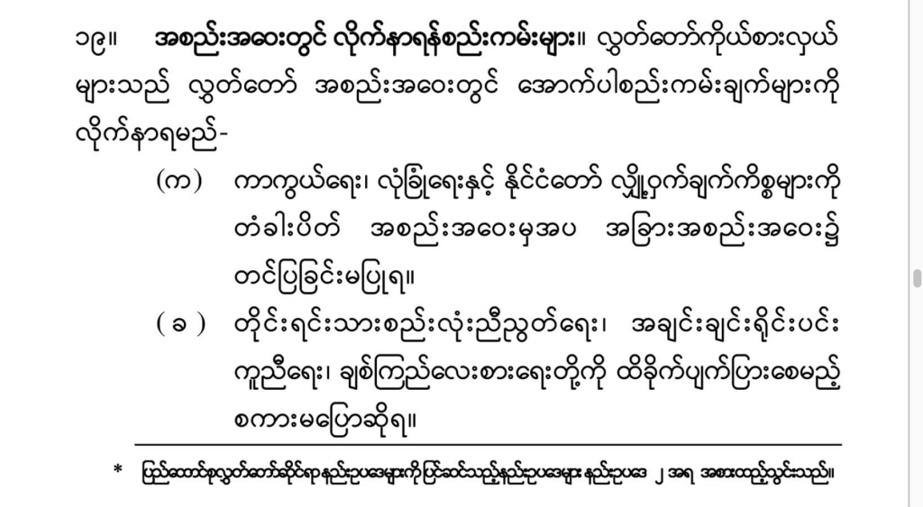 နည်းဥပဒေ ပုဒ်မ ၁၉ မှာ အစည်းအဝေးအတွင်းမှာလိုက်နာရမယ့် စည်းကမ်းချက် ၁၃ ချက်ကို ပြဋ္ဌာန်းထားတယ်။ ပြဋ္ဌာန်းချက်အများစုက လွှတ်တော်အတွင်း ဆွေးနွေးရာမှာ လွှတ်တော်ကိုယ် စားလှယ်တွေ လိုက်နာရမယ့် ကိုယ်နှုတ်အမူအရာတွေဖြစ်ပါတယ်။ ပုံ ၉ ၁၀၊ ၁၁ နဲ့ ၁၂