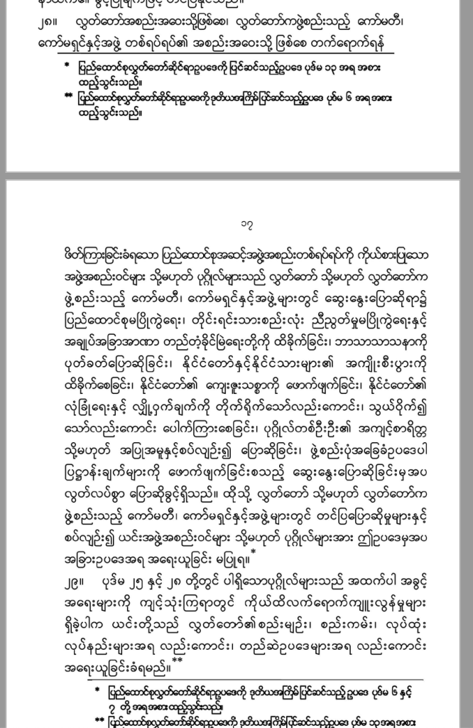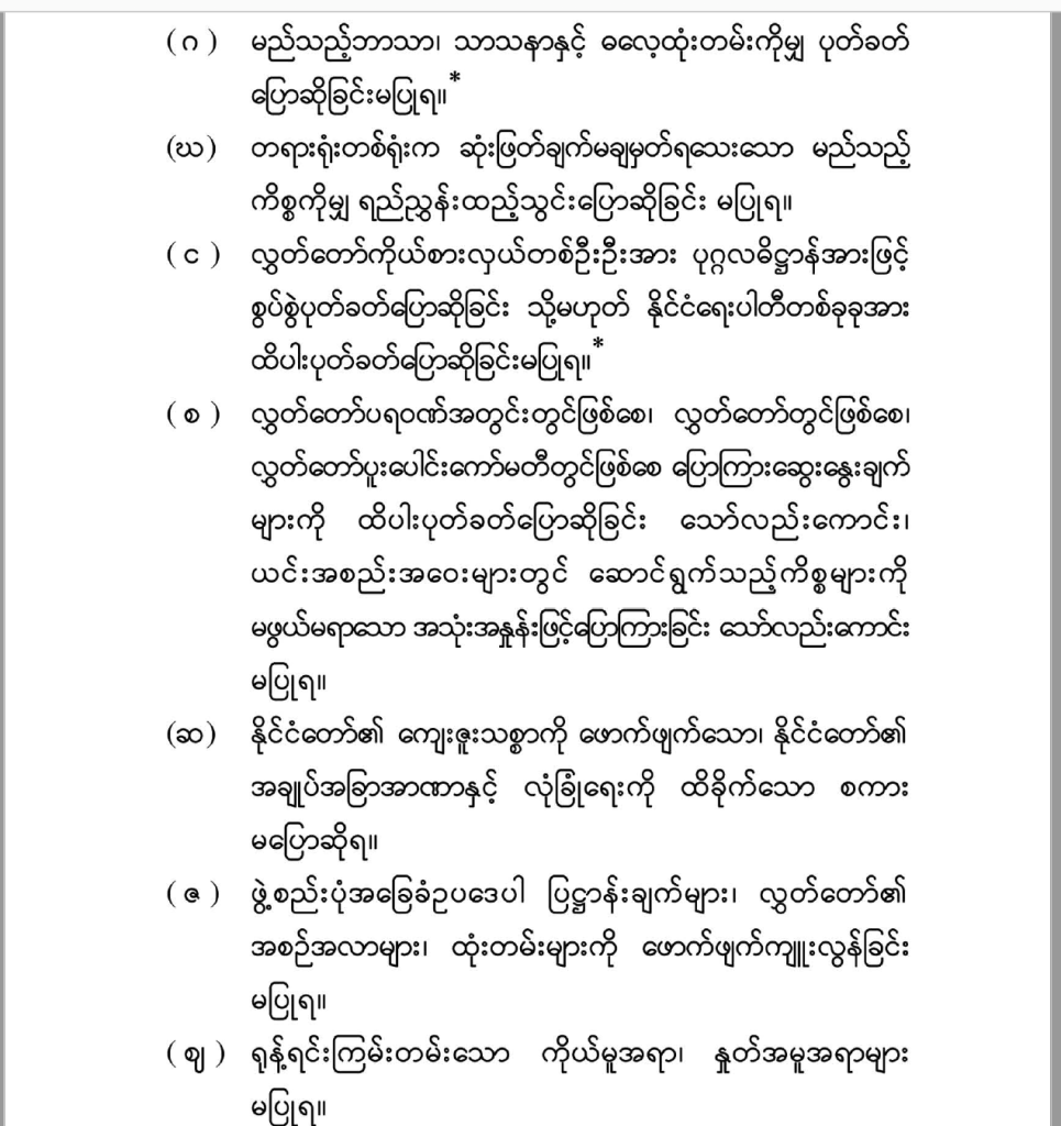 ပုဒ် ၂၅ မှတော့ ဆွေးနွေးရာမှာ ရှောင်ရှားရမယ့်အချက်တွေကို ဖော်ပြထားတယ်။ ပြီးရင် ဆွေးနွေးမှု တွေနဲ့ပတ်သက်ရင် ဒီဥပဒေနဲ့ပဲ အရေးယူရမယ်ဆိုတဲ့အချက်ကို ထပ်ပြီးဖော်ပြထားတယ်။ ပုံ ၅