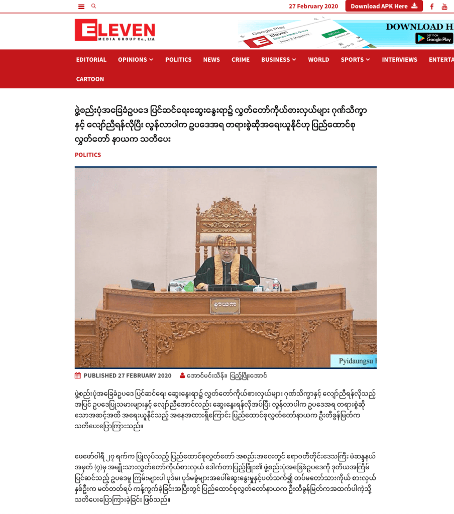 မနေ့ ( ဖေဖော်ဝါရီ ၂၇ ရက်) နေ့ ပြည်ထောင်စုလွှတ်တော်အစည်းအဝေးမှာ နာယက ဦးတီခွန် မြတ်က ဖွဲ့စည်းပုံအခြေခံဥပဒေ ပြင်ဆင်ရေးဆွေးနွေးတဲ့အခါ လွှတ်တော် ကိုယ်စားလှယ်များ ဂုဏ် သိက္ခာ နဲ့ ညီရန် လိုအပ်ပြီး အပြောအဆို လွန်လာပါက ဥပဒေအရ တရားစွဲဆို အရေးယူ နိုင်တယ် လို့ ပြောတဲ့ အကြောင်း သတင်းမီဒီယာတွေမှာဖော်ပြခဲ့ပါတယ်။ ပုံ ၁ နဲ့ ၂