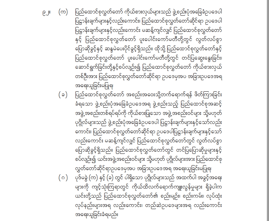 ၂၀၁၅ ခုနှစ် ဒီဇင်ဘာလမှာ ပြည်ထောင်စုလွှတ်တော်က ထုတ်ဝေခဲ့တဲ့ ပြည်ထောင်စုလွှတ်တော် ဆိုင်ရာ ဥပဒေ ၊နည်းဥပဒေများ (နောက်ဆုံးပြင်ဆင်ချက်များပါပြီး) မှာ လွှတ်တော်အတွင်း ဆွေး နွေးရာတဲ့အခါ လွှတ်တော်ကိုယ်စားလှယ်တွေရရှိမယ့်အခွင့်အရေး၊ လိုက်နာရမယ့် စည်းကမ်း များနဲ့ စည်းကမ်းချိုးဖောက်မှုတွေရှိရင် အရေးယူခံရမယ့် အချက်များကို ဖော်ပြထားပါတယ်။