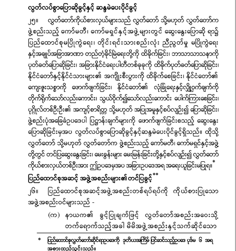 ဖွဲ့စည်းပုံအခြေခံဥပဒေ ပုဒ်မ ၉ ၂ မှာ လွှတ်တော်ကိုယ်စားလှယ်တွေဟာ ဖွဲ့စည်းပုံအခြေခံဥပဒေ၊ ပြည်ထောင်စုလွှတ်တော်ဥပဒေတွေနဲ့ မဆန့်ကျင်ရင် လွှတ်တော်တွင်းနဲ့ လွှတ်တော်ကော်မတီ တွေမှာ လွတ်လပ်စွာပြောဆိုဆွေးနွေးခွင့်ရှိတယ်။ ဒီလိုဆွေးနွေးဆောင်ရွက်တာနဲ့ပတ်သက်ပြီး လွှတ်တော်ကိုယ်စားလှယ်ကို ပြည်ထောင်စုလွှတ်တော်ဆိုင်ရာဥပဒေက လွဲပြီးကျန်တဲ့ဥပဒေနဲ့ အရေးမယူရဘူးလို့ပြဋ္ဌာန်းထားတယ်။ ဒါပေမယ့် အဲဒီအခွင့်အရေးတွေကို ကျင့်သုံးရာမှာ ကိုယ် ထိ လက်ရောက်ကျူးလွန်ရင်တော့ ပြည်ထောင်စုလွှတ်တော်စည်းကမ်းတွေအရဖြစ်စေ၊ တည်ဆဲဥပဒေ အရဖြစ်စေ အရေးယူခံရမယ်လို့ သတိပေးထားတယ်။ ပုံ ၃