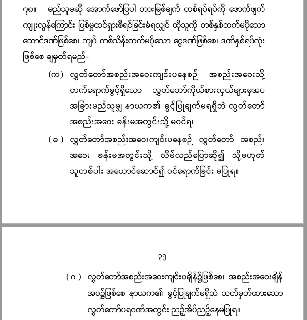 ပြည်ထောင်စုလွှတ်တော်ဆိုင်ရာ ဥပဒေ ပုဒ်မ ၁၁ မှာ လွှတ်တော်အတွင်း နဲ့ လွှတ်တော်ပူးပေါင်း ကော်မတီမှာဆွေးနွေးတာတွေနဲ့ပတ်သက်ပြီး ဒီဥပဒေက လွဲပြီး အခြားဥပဒေနဲ့ အရေးယူခြင်းက နေ ကင်းလွတ်ရမယ်လို့ အတိအကျဖော်ပြထားပါတယ်။ ပုံ ၄