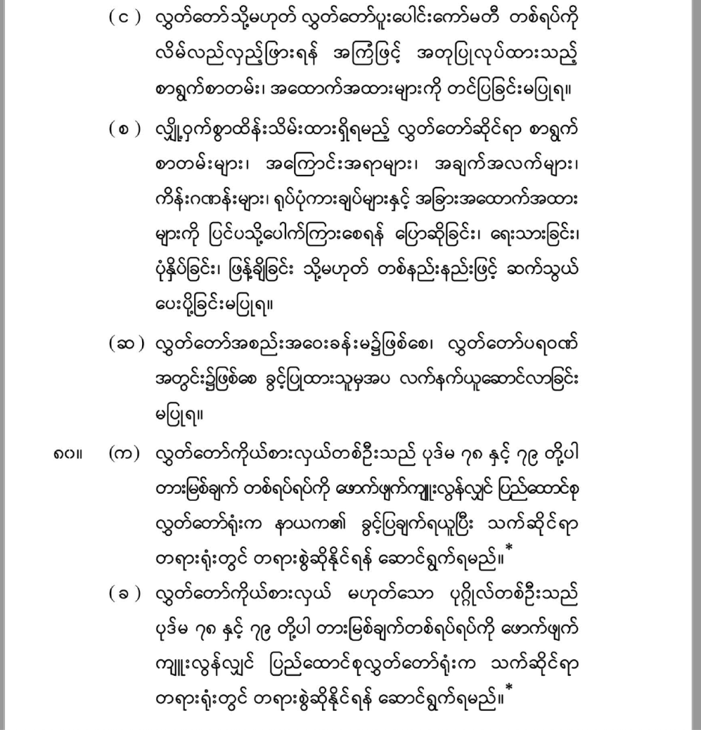 ပုဒ်မ ၇၉ မှာ လွှတ်တော်အတွင်း ဆန္ဒပြခြင်း၊ဆူပူခြင်း နှောင့်ယှက်ခြင်းလုပ်ရင်၊ ဆွေးနွေးမေးမြန်းဖို့ ဖိတ်ခေါ်ထားသူကို သွေးဆောင်ခြိမ်းခြောက်ရင်၊လွှတ်တော်ကိုယ်စားလှယ်တစ်ဦးကို ကိုယ်ထိလက် ရောက် လုပ် ရင်၊ လွှတ်တော်ဝန်ထမ်းကို ဝတ္တရားနှောင့်ယှက်ရင်၊ စာရွက်စာတမ်း အတုလုပ်ရင်၊ လ ျှို့ဝှက် အဆင့်ရှိ စာရွက်စာတမ်းတွေပေါက်ကြားရင်၊ ခွင့်ပြုချက်မရဘဲ လွှတ်တော်ထဲကို လက်နက် ယူလာ ရင် အများဆုံး ထောင်ဒဏ် နှစ် နှစ်၊ ဒါမှ မဟုတ် ဒဏ်ငွေ နှစ်သိန်း၊ဒါမှမဟုတ် ပြစ်ဒဏ် နှစ်ခုလုံးချမှတ်နိုင်တယ်လို့ ပြဋ္ဌာန်းထားတယ်။ ပုံ ၈ နဲ့ ၉