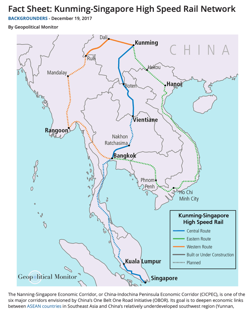 ဒီရထားလမ်းက နန်နင်း – စင်္ကာပူ စီးပွားရေးစင်္ကြန် ၊ ဒါမှမဟုတ် တရုတ်- အင်ဒိုချိုင်းနား ကျွန်းဆွယ် စီးပွားရေးစင်္ကြန် China-Indochina Peninsula Economic Corridor (CICPEC) ရဲ့ အစိတ်အပိုင်း ဖြစ်ပါတယ်။ ဒီစင်္ကြန်က တရုတ်နိုင်ငံကဆောင်ရွက်နေတဲ့ စီးပွားရေးစင်္ကြန် ခြောက်ခုထဲက တစ်ခု ဖြစ်ပါတယ်။ ပုံ ၁