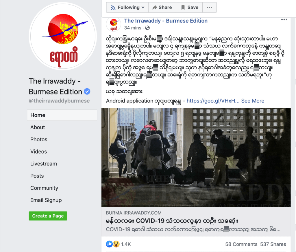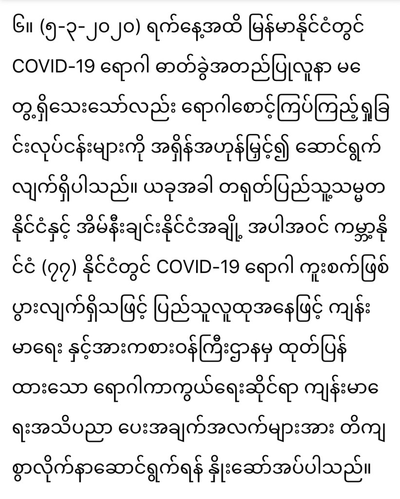 ဧရာဝတီသတင်းဌာန မှာ ဖော်ပြထားတဲ့ ကရိုနာဗိုင်းရပ်စ် သံသယလူနာ သေဆုံးတယ်ဆိုတဲ့ သတင်းနဲ့ပတ်သက်ပြီး ကျန်းမားရေးနဲ့ အားကစားဝန်ကြီးဌာနက တိတိကျကျ သတင်းထုတ်ပြန်ပေးရင်ကောင်းမယ်။