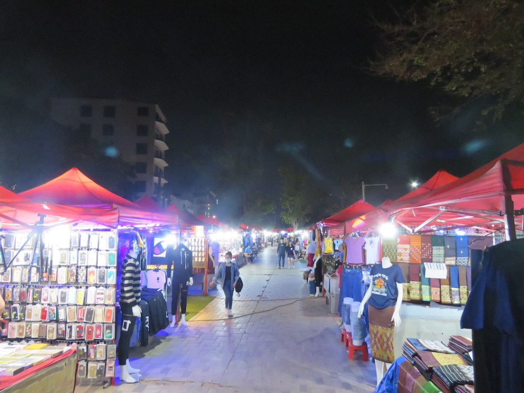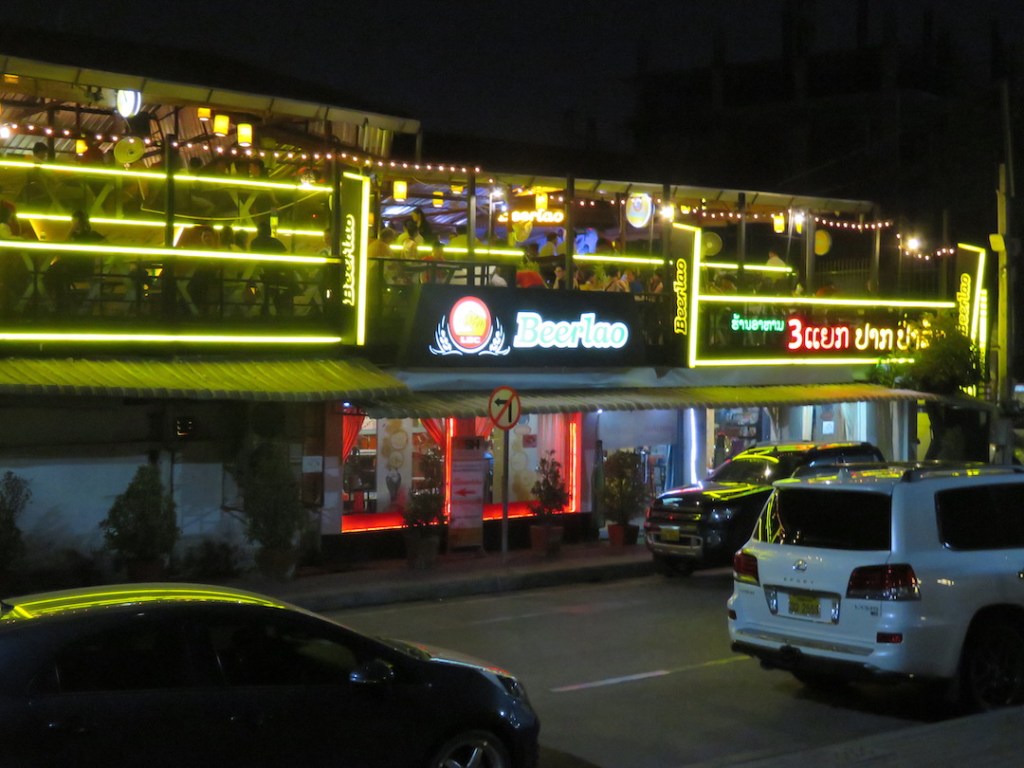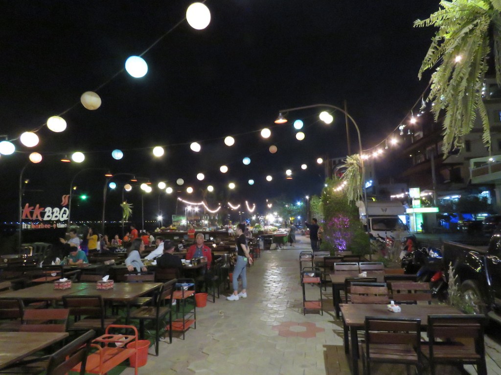 ပန်းခြံထဲက ဈေးတန်းကတော့ ည ဆယ့်တစ်နာရီမှာ သိမ်းတယ်။ ကမ်းနားလမ်းပေါ်က အကင် ဆိုင်တွေကတော့ မနက်တစ်နာရီလောက်အထိ ဖွင့်တယ်။ အကင်ဆိုင်တွေကတော့ ပင်လယ် စာ တွေများတယ်။ ဘီယာကတော့ မြန်မာနိုင်ငံမှာ မြန်မာဘီယာ နာမည်ကြီးသလို လာအို မှာ လည်း “လာအိုဘီယာ Beer Lao” က နာမည်ကြီးတယ်။ ကျွန်တော်တို့ ရောက်သွားတဲ့အချိန် ကတော့ တရုတ်ခရီးသွားတွေ အလာနည်းလို့ အကင်ဆိုင်တွေ ရောင်းအားကျနေတယ်။