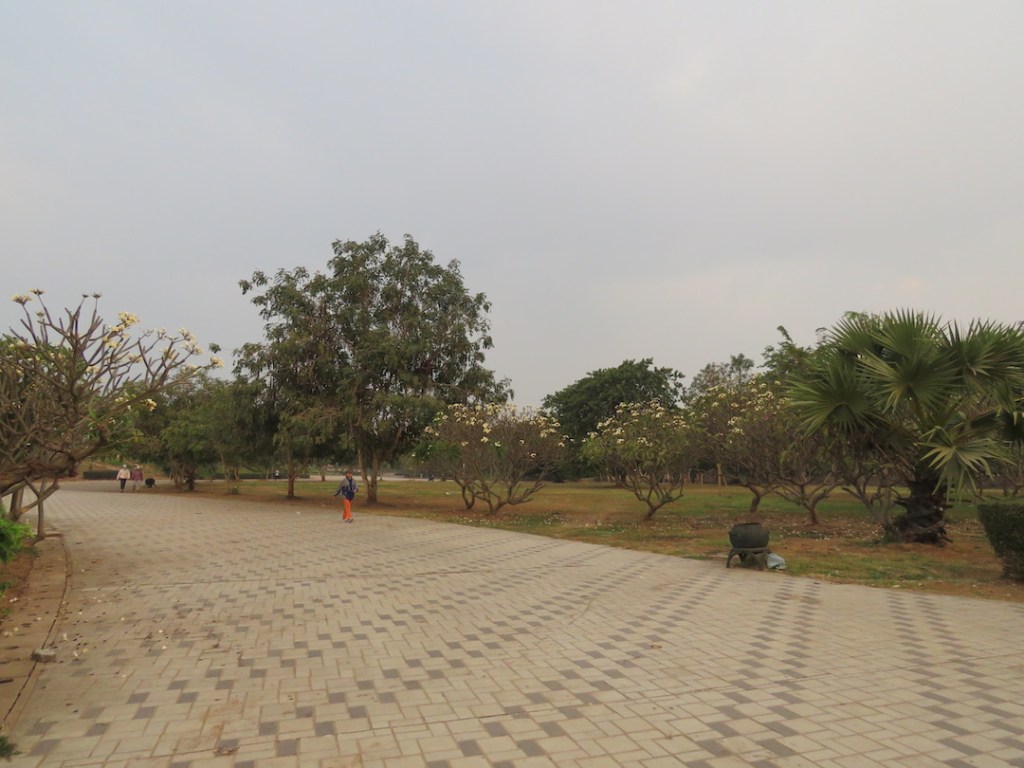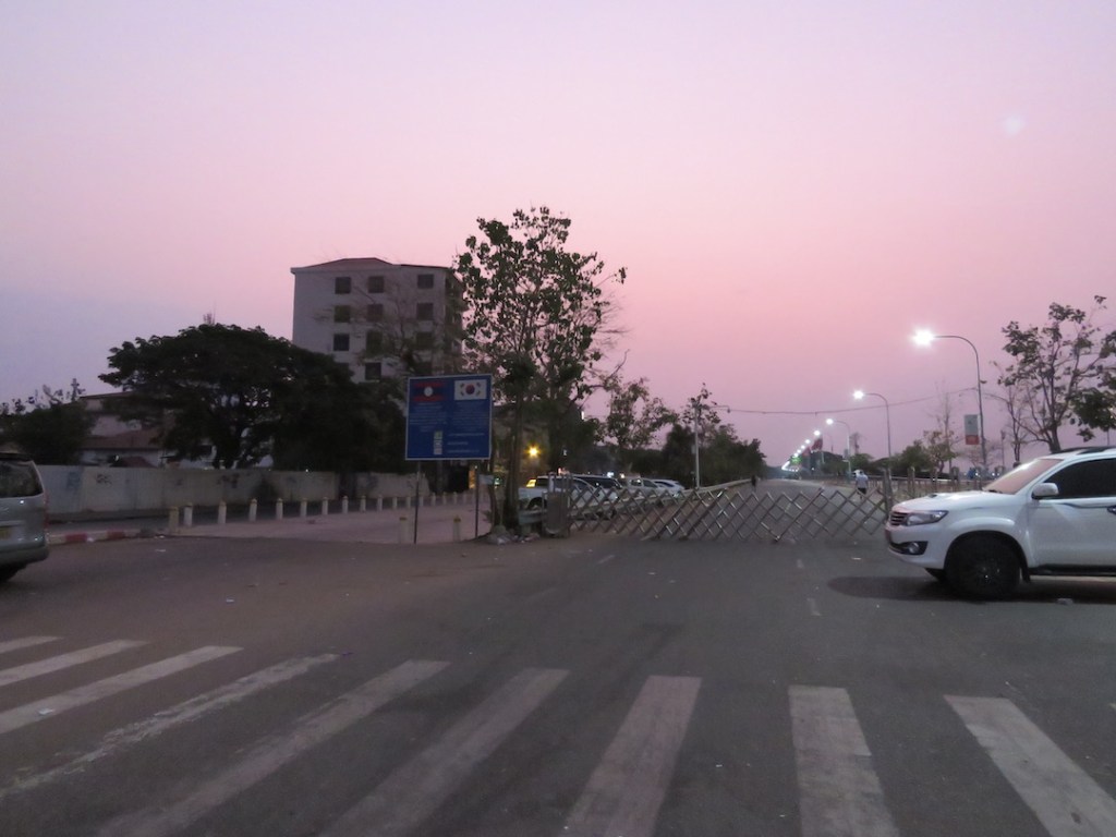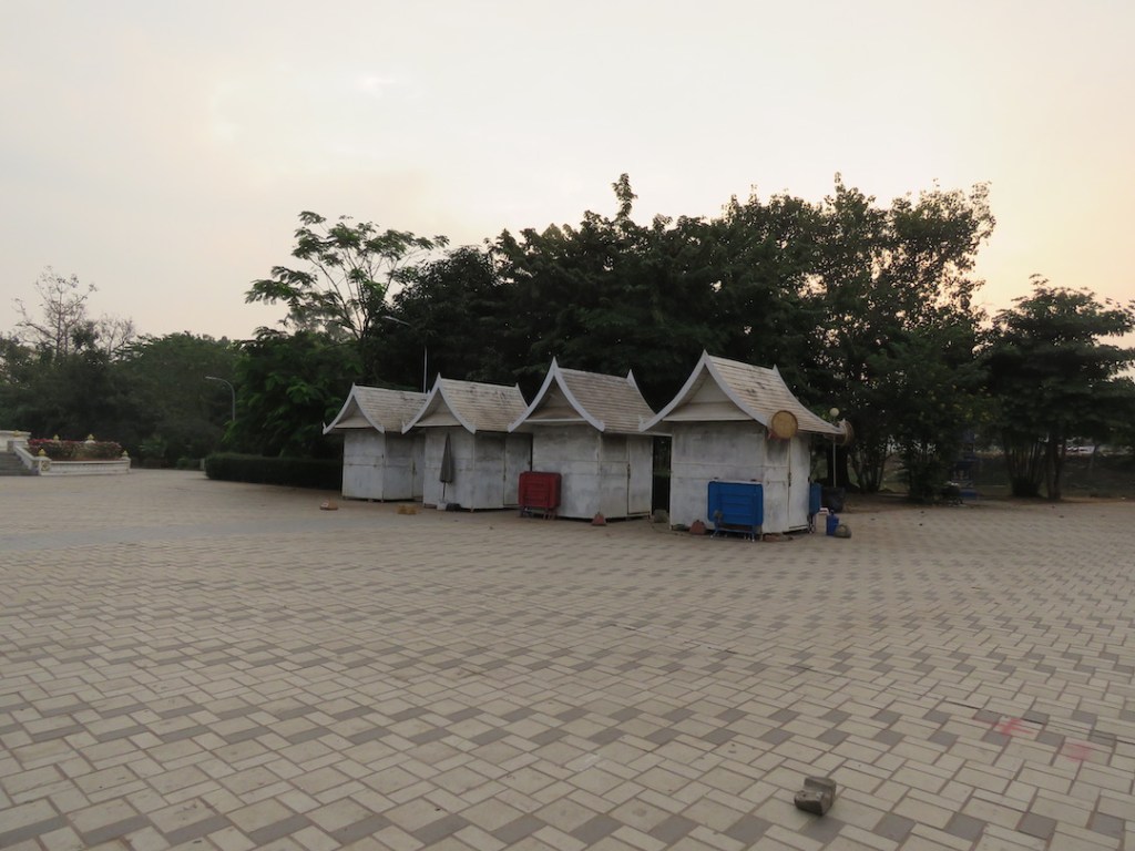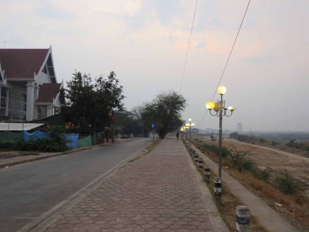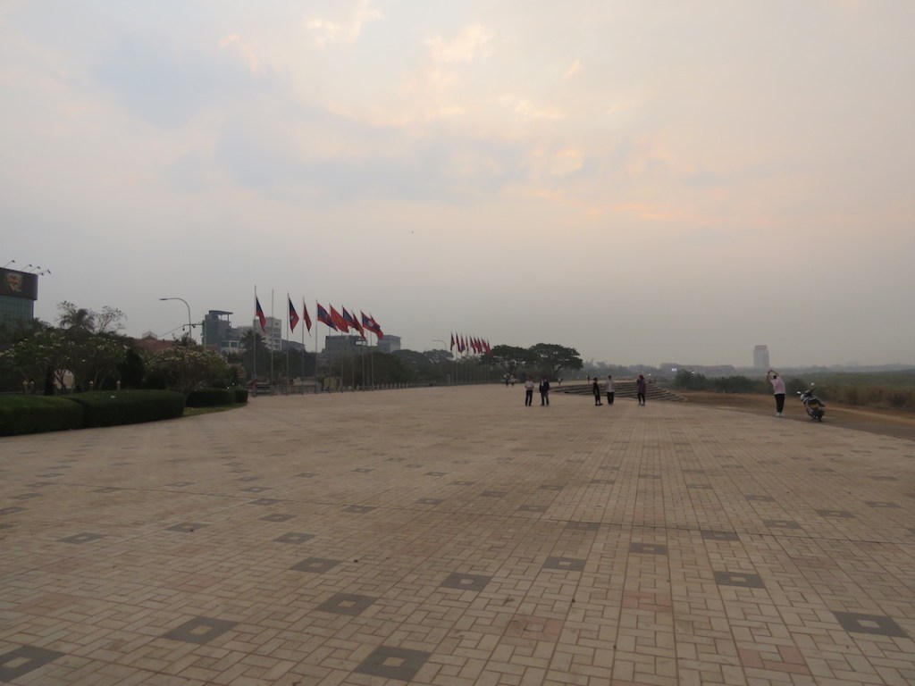 ဈေးတန်းဆုံးတဲ့အခါ ပလက်ဖောင်းပေါ်မှာ ဆိုင်တွေမရှိတော့ဘူး။ ကားလမ်းကလည်း ပိုကျယ် သွား တယ်။ ကမ်းနားလမ်းအလယ်ဗဟိုလောက်မှာ ရင်ပြင်တစ်ခုရှိတယ်။လာအို အလံတွေ ထောင်ထားတယ်။ ရင်ပြင်က ကားလမ်းကနေ မြစ်ကမ်းပေါ်ကို လခြမ်းပုံ ထိုး ထွက် နေတယ်။ ကမ်းနားမှာ ဒီနေရာက အကျယ်ဆုံး ဆိုတော့ မနက်စောစောရော၊ ညနေဘက်မှာ ပါ ထိုင်တဲ့သူများတယ်။