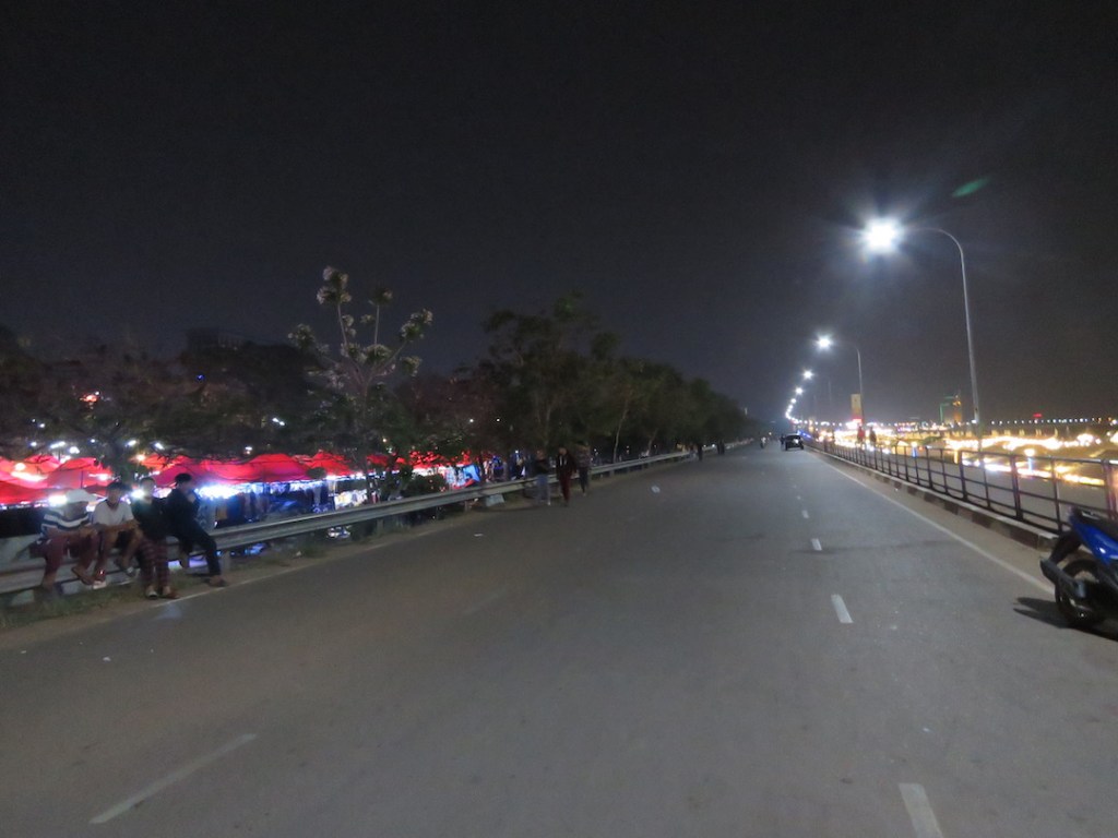 မဲခေါင် ကမ်းနားလမ်းညဈေးက ညနေ ခြောက်နာရီမှာ စတယ်။ ရင်ပြင်ဘက်အခြမ်းမှာ ရှိတဲ့ ကမ်းနား လမ်းမကြိးကို ညနေ ခြာက်နာရီကနေ နောက်နေ့မနက် ခြောက်နာရီခွဲအထိ ပိတ် ထား ပေးတယ်။ ပန်းခြံလုပ်ထားတဲ့နေရာမှာလည်း ဈေးဆိုင်တွေဖွင့်တယ်။ ကားရပ် ဖို့ နေရာ၊ ဆိုင်ကယ်ထားဖို့နေရာတွေရှိတယ်။ ပန်းခြံထဲကဆိုင်တွေကတော့ တရုတ်လုပ် ပစ္စည်း တွေများပါတယ်။ ဈေးကလည်း ထက်ဝက်လောက်ဆစ်နိုင်မှ တော်ကာကျတယ်။