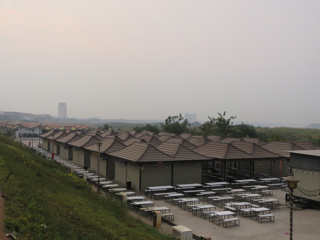 ရင်ပြင်ကျော်သွားရင်တော့ တာဘောင်အောက်ဘက် မြေပြန့်မှာ ဈေးဆိုင်တန်းတွေရှိတယ်။ ဒီနေရာက သောင်ပြင်လိုဖြစ်နေတဲ့နေရာမှာဆောက်ထားတာ။ ဆိုင်တန်းတွေက ပုံစံသုံးမျိုး နဲ့ ။ ကိုရီးယားရိုးရာခေါင်မိုးပုံစံနဲ့ ဆိုင်တန်းတွေက စားသောက်ဆိုင်တန်းတွေ၊ လာအို ရိုးရာ ဒီဇိုင်း ပုံ နဲ့ဆိုင်တန်းတွေက လက်မှုပစ္စည်းတွေနဲ့ အမှတ်တရ ပစ္စည်တွေရောင်းတာ၊ အမိုးနှစ်ထပ်နဲ့ဆိုင် တန်းတွေကတော့ စားသောက်ဆိုင်တစ်ဆိုင်၊နှစ်ဆိုင်နဲ့ အဝတ်အထည်ဆိုင်တွေရှိတယ်။ အဲဒါ ရဲ့ အဆုံးမှာတော့ ကလေးကစားကွင်းတစ်ခုရှိတယ်။ အဲဒီအလွန်မှာတော့ ကွန်ကရစ်ခင်းနေတဲ့ နေ ရာတစ်ခုရှိတယ်။ နောက်ထပ်ဈေးဆိုင်ခန်းတွေ လုပ်ဖို့ထင်ပါရဲ့။