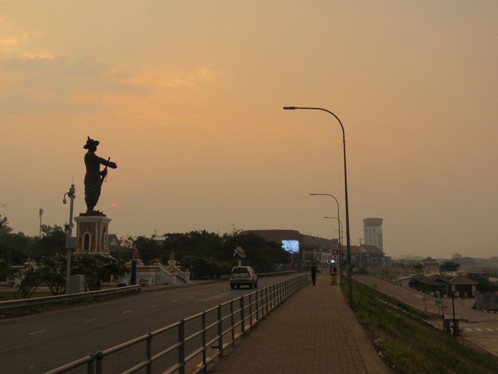ရင်ပြင်နဲ့ မျက်နှာချင်းဆိုင် ကားလမ်းတစ်ဖက်မှာတော့ ထိုင်းဘက်ကမ်းကို လက်ညှိုးညွှန်ထားတဲ့ ရုပ်တု တစ်ခုရှိတယ်။ အဲဒါက ၁၈၂၆ ခုနှစ်က လာအိုနိုင်ငံကို သိမ်းထားတဲ့ ထိုင်းတွေကို ပြန် တော် လှန်ခဲ့တဲ့ လာအို ဘုရင် Anouvong ရဲ့ ရုပ်တုပါ။ ဒါပေမယ့် သူ့တော်လှန်ရေးက မအောင်မြင်ခဲ့ ဘူး။ ၁၈၂၇ ခုနှစ်မှာ သူ့ကို ဖမ်းမိပြီး ကွပ်မျက်လိုက်တယ်။ ဗီယန်ကျန်းမြို့ကိုလည်း လုံး၀ ဖျက်ဆီး ပစ်ခဲ့တယ်။ နောက်နှစ်သုံးဆယ်ကျော် ပြင်သစ်တွေ ဒီဒေသကို ရောက်လာတော့ ဗီယန်ကျန်းမြို့က တောဖုံးနေတဲ့ မြို့ပျက်ကြိးဖြစ်နေပြီ။ အခုမြင်ရတဲ့ မြို့က ပြင်သစ်အစောင့်အရှောက်ခံ ဘဝမှာ ပြန် တည်ဆောက်ထားတာဖြစ်ပါတယ်။ ထိုင်းတွေက ဗီယန်ကျန်းကို ဖျက်ဆီးပစ်လိုက်သလို အဲဒီ ဒေသက လာအို လူမျိုးတွေကိုလည်း ထိုင်းနိုင်ငံအနောက်မြောက်ပိုင်းကို ရွှေ့ပြောင်းနေရာချထား ခဲ့ပြီး ဗီယန်ကျန်းမှာလာအိုမင်းဆက်ပြန်မထူထောင်နိုင်အောင်လုပ်ပစ်ခဲ့တယ်လို့ဆိုတယ်။ ဒီရုပ်တု ကိုတော့ ဗီယန်ကျန်းမြို့တည်နှစ် ၄၅၀ ပြည့်အထိမ်းအမှတ်အဖြစ် ၂၀၁၀ ပြည့်နှစ်မှာ ထားရှိ ခဲ့တာဖြစ်ပါ တယ်။