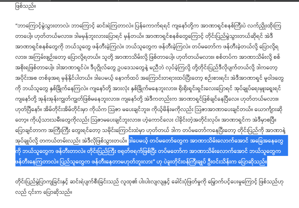 ဒါက တပ်မတော်ကနေပြီးတော့ တိုင်းပြည်ကို အာဏာနဲ့ အုပ်ချုပ်လို့ တကယ်တမ်းလည်း အဲဒီလိုဖြစ်သွားတယ်။ ဒါပေမယ့် တပ်မတော်တွေက အာဏာသိမ်းလောက်အောင် အခြေအနေတွေကို ဘယ်သူတွေက ဖန်တီးတာလဲ။ တိုင်းပြည်ကြီး ဗရုတ်ဗရက်ဖြစ်ပြီး တပ်မတော်က အာဏာသိမ်းလောက်အောင် ဘယ်သူတွေက ဖန်တီးနေကြတာလဲ။ ပြည်သူတွေက ဖန်တီးနေတာမဟုတ်ဘူးလား” ဟု ပဲခူးတိုင်းဝန်ကြီးချုပ် ဦးဝင်းသိန်းက ပြောဆိုသည်။