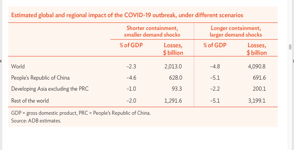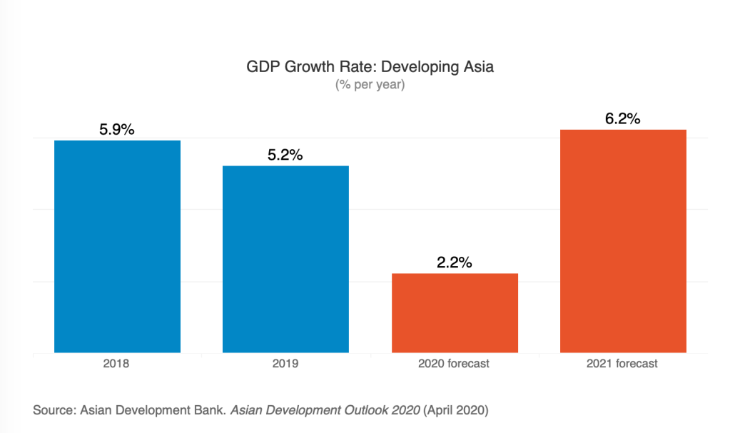 ဧပြီလ ၃ ရက်နေ့မှာ အာရှဖွံ့ဖြိုးရေးဘဏ် (ADB) က အာရှစီးပွားရေးအခြေအနေ ခန့်မှန်းချက် ၂၀၂၀ ကို ထုတ်ပြန်ခဲ့တယ်။ ဒါပေမယ့် ဒီအစီရင်ခံစာဟာ ၂၀၂၀ မတ်လ ၂၀ ရက်နေ့အထိ ရရှိ ထားတဲ့ ကိန်းဂဏန်းအချက်အလက်တွေကို အခြေခံထားတာဖြစ်ပြီး လက်ရှိ ကိုရိုနာဗိုင်းရပ်စ် ကပ် ဘေးကို ၂၀၂၀ ပြည့်နှစ်မှာ ကျော်လွှားနိုင်မယ်၊ ၂၀၂၁ ခုနှစ် မှာ စီးပွားရေးအခြေအနေ ပုံမှန် ပြန်ဖြစ်မယ်ဆိုပြီး တွက်ချက်ထားတာဖြစ်တဲ့အကြောင်း ADB က ပြောထားတယ်။