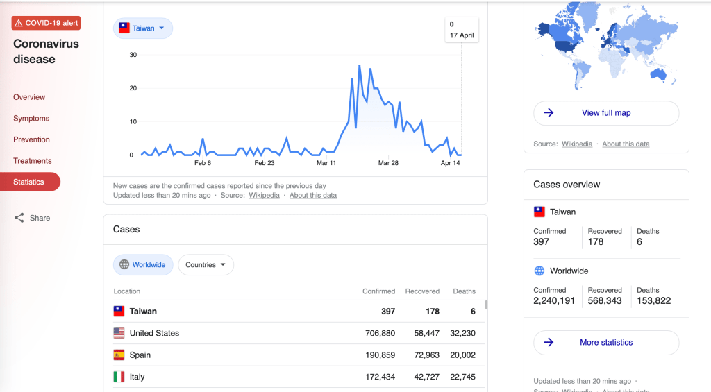 အဲဒီအခြေအနေတွေအရ တိုင်ဝမ်ဟာ ကိုရိုနာဗိုင်းရပ်စ် အကြီးအကျယ်ကူးစက်ခံရမယ့်အခြေအနေ မှာ ရှိတယ်။ ဒါပေမယ့် အဲဒီလို မဖြစ်ခဲ့ဘူး။ ဧပြီ လ ၁၇ ရက်နေ့ စာရင်းအရ တိုင်ဝမ်မှာ ရောဂါ ပိုး တွေ့ရှိသူ ၃၉ ၇ ဦးရှိတယ်၊ ၆ ဦးသေဆုံးတယ်၊ ၁၇၈ ဦး ကျန်းမာရေးပြန်ကောင်းလာပြီ။