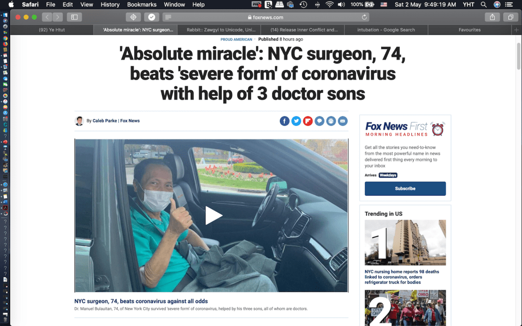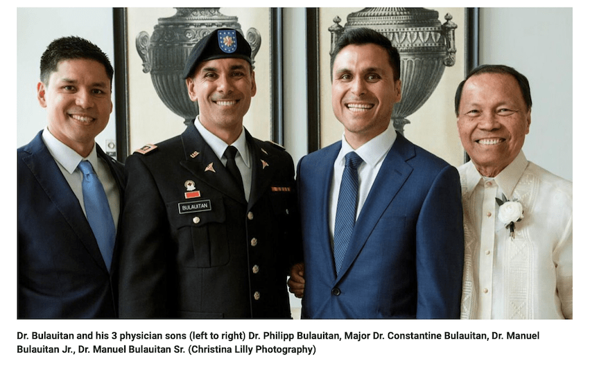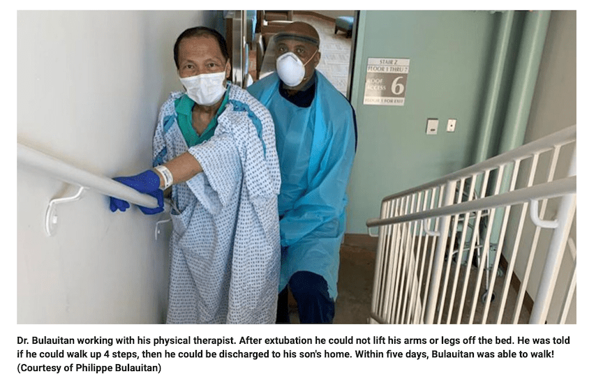 ဒါပေမယ့် Manuel Bulauitan ကတော့ ကိုဗစ် ၁၉ နဲ့ တစ်လခွဲလောက်တိုက်ပွဲဝင်ပြီး အောင်ပွဲခံ ခဲ့တယ်။ Manuel Bulauitan ကိုယ်တိုင်က ခွဲစိတ်ဆရာဝန်ဖြစ်ပါတယ်။ သူ့သားသုံးယောက် လုံးကလည်း ဆရာဝန်တွေ၊ သားအကြီးဆုံးက အမေရိ ကန်တပ်မတော်အရန်တပ်ဖွဲ့ဝင် ဆရာဝန်။ အငယ်နှစ်ယောက်က အရပ်ဘက် ဆရာဝန်တွေ၊
