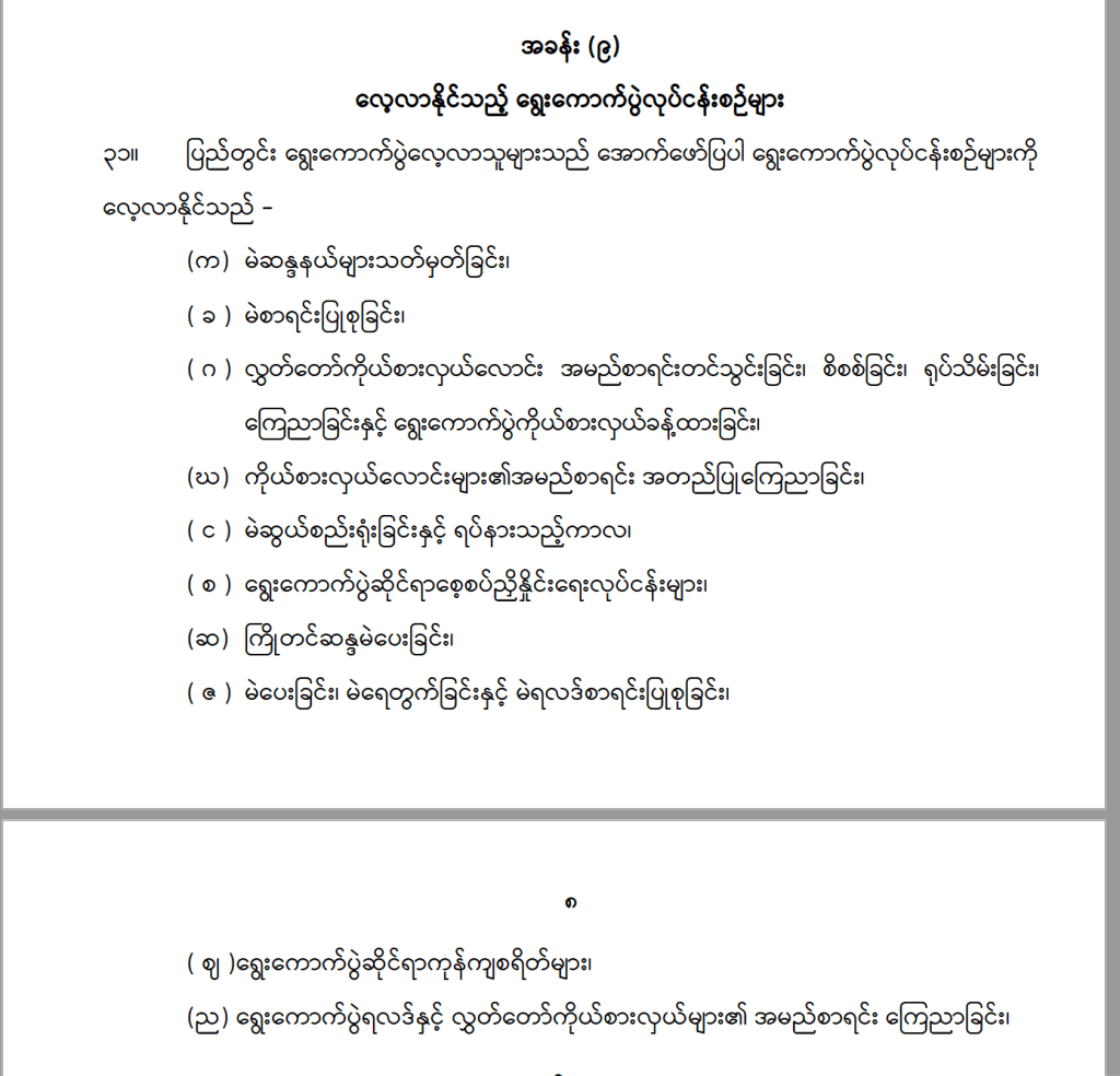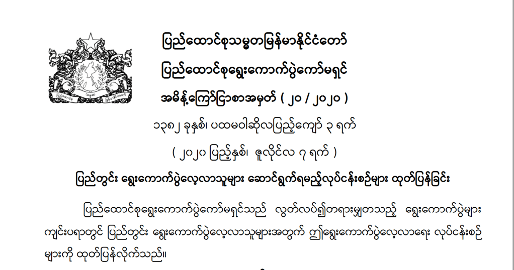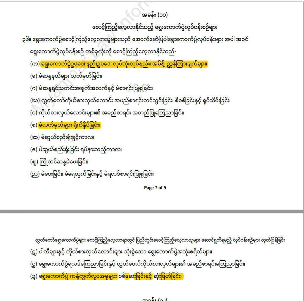 ၁။ ရွေးကောက်ပွဲဥပဒေ၊ နည်းဥပဒေ၊ လုပ်ထုံးလုပ်နည်း၊အမိန့် နှင့် ညွှန်ကြားချက်များ။