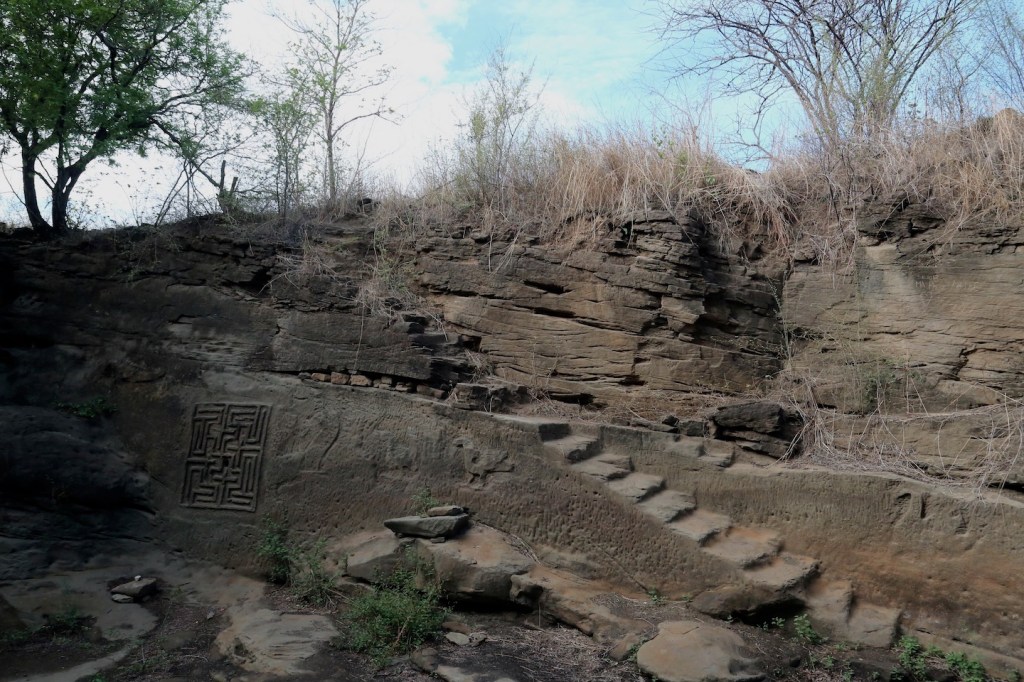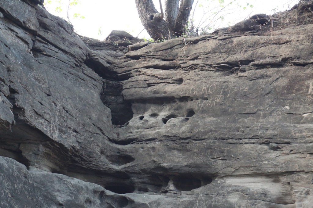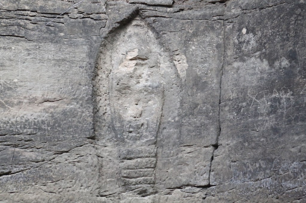 သဘာဝကျောက်နံရံတွေမှာ ငါး၊ မိချောင်း၊ငှက်၊ မြွေ လို့ထင်ရတဲ့အရုပ်တွေထွင်းထားတယ်။ မှိန် နေလို့ မှန်းကြည့်လို့ပဲရတယ်။ အထင်ရှားဆုံးကတော့ လေးထောင့်စတုရန်းကွက်ပုံပဲ၊ ရုတ် တရက်ကြည့်ရင် တရုတ်စာလို့ထင်ရပေမယ့်မဟုတ်ပါဘူး။