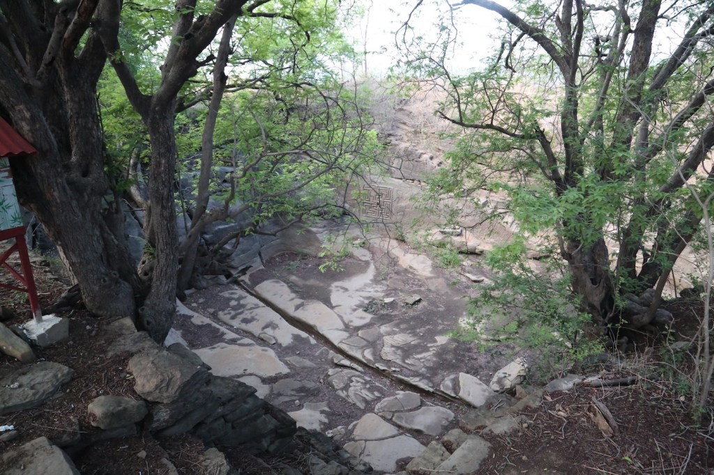 တောင်ခြေ အုတ်ရေကန်ကနေ မိနစ်နှစ်ဆယ်လောက်လေ ျှာက်လိုက်ရင် သစ်ပင်အုပ်လေး ကြား မှာ နတ်စင်လေးတစ်ခုတွေ့မယ်။ အဲဒီနတ်စင်အလွန်မှာ နတ်ရေကန်ပဲ။ ဒီရေကန် သုံးဘက် သုံး တန်က သဘာဝကျောက်သားတွေနဲ့ ၊ နတ်စင်ရှိတဲ့ဘက် အမြင့်တစ်ဝက်မှာတော့ လူလုပ် ကျောက်အုပ်တွေနဲ့ နံရံလုပ်ထားတယ်။ ကန်ထဲကို ဆင်းဖို့ ကျောက်လှေကားလုပ် ထားတယ်။ ကန်က ရေမနေတော့ဘူး။