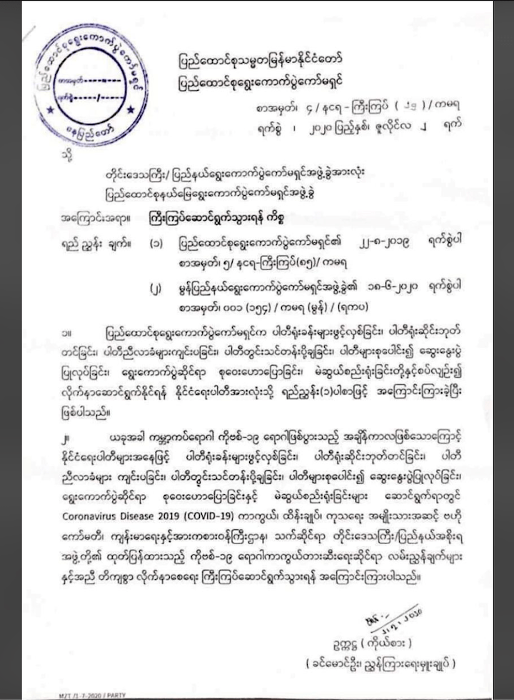 ဒ့ါကြောင့် ရွေးကောက်ပွဲဆိုင်ရာလှုပ်ရှားမှုတွေ၊ ပါတီလုပ်ငန်းဆောင်ရွက်မှုတွေကို ကိုဗစ် ရောဂါ တားဆီးရေးဆိုင်ရာ အချက်တွေနဲ့ အညီ ဘယ်လိုလုပ်ရမလဲဆိုတာ ဝေခွဲလို့မရဖြစ်နေတဲ့ နိုင်ငံရေးပါတီတွေအနေနဲ့ အခုဖြစ်စဉ် နှစ်ခု မှာ ဒေါ်အောင်ဆန်းစုကြည် နဲ့အင်န်အယ်လ်ဒီ ပါတီဝင်တွေဆောင်ရွက်ခဲ့တဲ့အတိုင်း အတိအကျ လုပ် ဆောင်ရင်ဖြင့် အဆင်ပြေနိုင် မယ်လို့ထင်ပါတယ်။ လိုအပ်လို့ ကွန်ဗင်းရှင်စင်တာ (၂) ကို ငှား ပြီး ပါတီအခမ်းအနားလုပ် မယ်ဆိုရင်လည်း တာဝန်ရှိသူတွေက ခွင့်ပြုမယ့်အခြေအနေရှိပါတယ်။