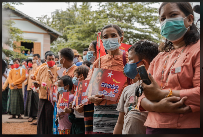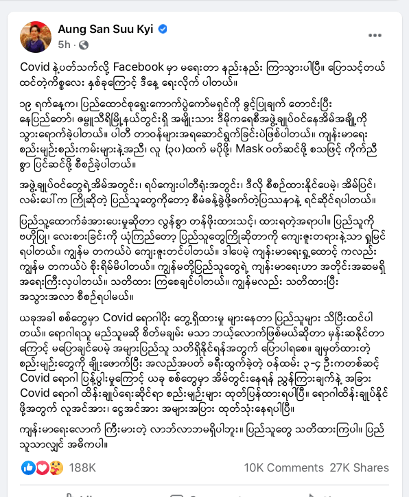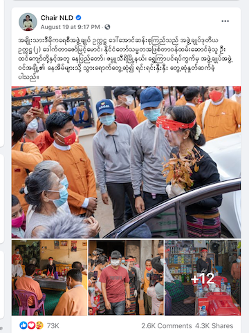 ဒေါ်အောင်ဆန်းစုကြည်ကိုယ်တိုင်ကလည်း အဲဒီအခြေအနေကို သတိပြုမိပုံရပါတယ်။ သြဂုတ် လ ၂၁ ရက်နေ့ သူ့ဖေ့စ်ဘွတ်ပို့စ်မှာ အဖွဲ့ချုပ် အဖွဲ့ဝင်တွေရဲ့ အိမ်အတွင်း၊ ရပ်ကျေးပါတီရုံးအတွင်း မှာ လူ ၃၀ ထက်မပိုအောင်၊ Mask ဝတ်ဆင်ဖို့ စီစဉ်နိုင်ပေမယ့် လမ်းပေါ်က ကြိုဆိုတဲ့ ပြည်သူ တွေကိုတော့ စီမံခန့်ခွဲဖို့ခက်ပါတယ် လို့ ရေးထားပါတယ်။ ပုံ (၅)