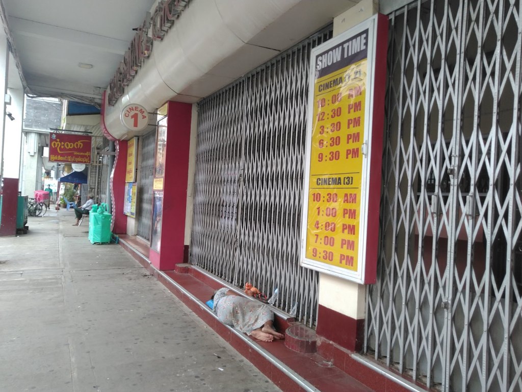 ကိုမြင့်ဦးဆီကနေ ကုန်းတံတားပေါ်ပြန်တက်၊ ရုပ်ရှင်ရုံတွေဘက်ကို ပြန်သွားတယ်။ ရှေ့ ဆောင်၊ နေပြည်တော် အားလုံးအိပ်ပျော်နေကြတယ်။ ရှေ့ဆောင်ရုံအောက်က လှေကားထစ်တွေပေါ်မှာ အမျိုးသမီးတစ်ယောက်အိပ်ပျော်နေတယ်။ သူ့ဘေးက ဘာဂျာတံခါးနားမှာ အထုတ်တစ်ထုပ်၊ ဖိနပ်တစ်ရံနဲ့ ရေသန့်ဘူးတစ်ဘူးရှိတယ်။ ဗိုလ်ချုပ်လမ်းအတိုင်းဆက်လေ ျှာက်တယ်။ ဝဇီရာ၊ သွင်ရုံ သရဲခြောက်မှာ စိုးရိမ်ရတယ်။ သွင်ရုံအောက်က တစ်ခုတည်းသောလှုပ်ရှားမှုကတော့ ပေါင် ချိန်စက်တစ်လုံးနဲ့ထိုင်နေတဲ့သူပဲ။ ငယ်စဉ်ကတော့ ရုပ်ရှင်ကားကောင်းရင် တန်းစီတိုးရတယ်။ စောသေးရင် ကာတွန်းစာအုပ်ငှားဖတ်၊ ရေခဲရေဝယ်သောက်၊ လက်မှတ်ရုံဖွင့် ပြီဆိုတာနဲ့ ဟေး ဟေး အော်ပြီးတိုး၊ ရဲက သံဘောင်ပေါ်မှာထိုင်ပြီး ကြားဖြတ်ဝင်သူတွေကို ခါးပတ်နဲ့ ရိုက်၊ လက်မှတ်တိုးရတာကိုက ဖျော်ဖြေရေးတစ်ခုပဲ။