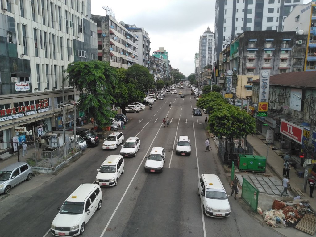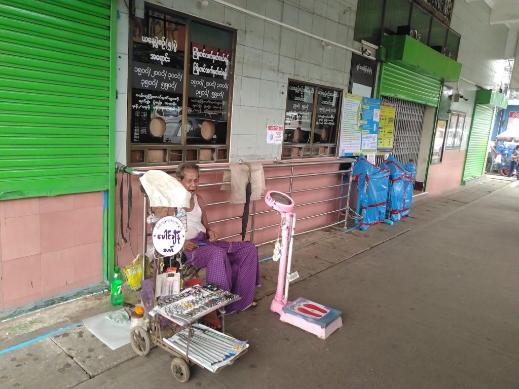 လမ်းတွေပေါ်မှာ၊ ပလက်ဖောင်းတွေပေါ်မှာ မသွားမဖြစ်သွားလာနေရတဲ့သူတွေ၊ သွားချင်လို့ သွား နေတဲ့သူတွေ ရှိနေဆဲပဲ။ ဆူးလေကုန်းကျော်တံတားပေါ်မှာ ဓာတ်ပုံရိုက်တဲ့သူတွေလည်း ရှိနေတာ ပဲ။ ကျွန်တော်ရှာနေတဲ့သူက ဆူးလေတာဝါ ၁ ဘေးမှာ ရှိတယ်။ ကိုမြင့်ဦးတဲ့။ ဖုန်းစတစ်ကာတွေ ကပ်ပေးတဲ့သူပေါ့။ သူ့အကြောင်းလည်း ပို့စ်ရေးဖူးတယ်။