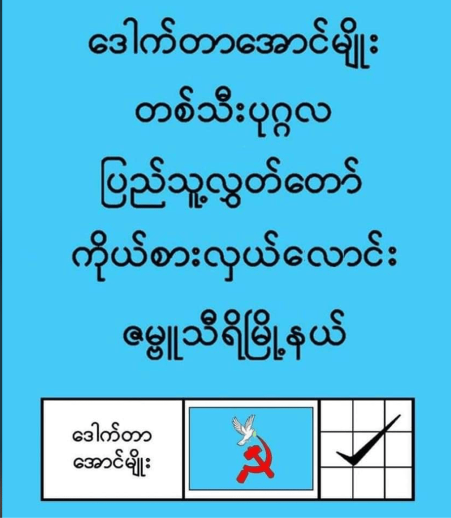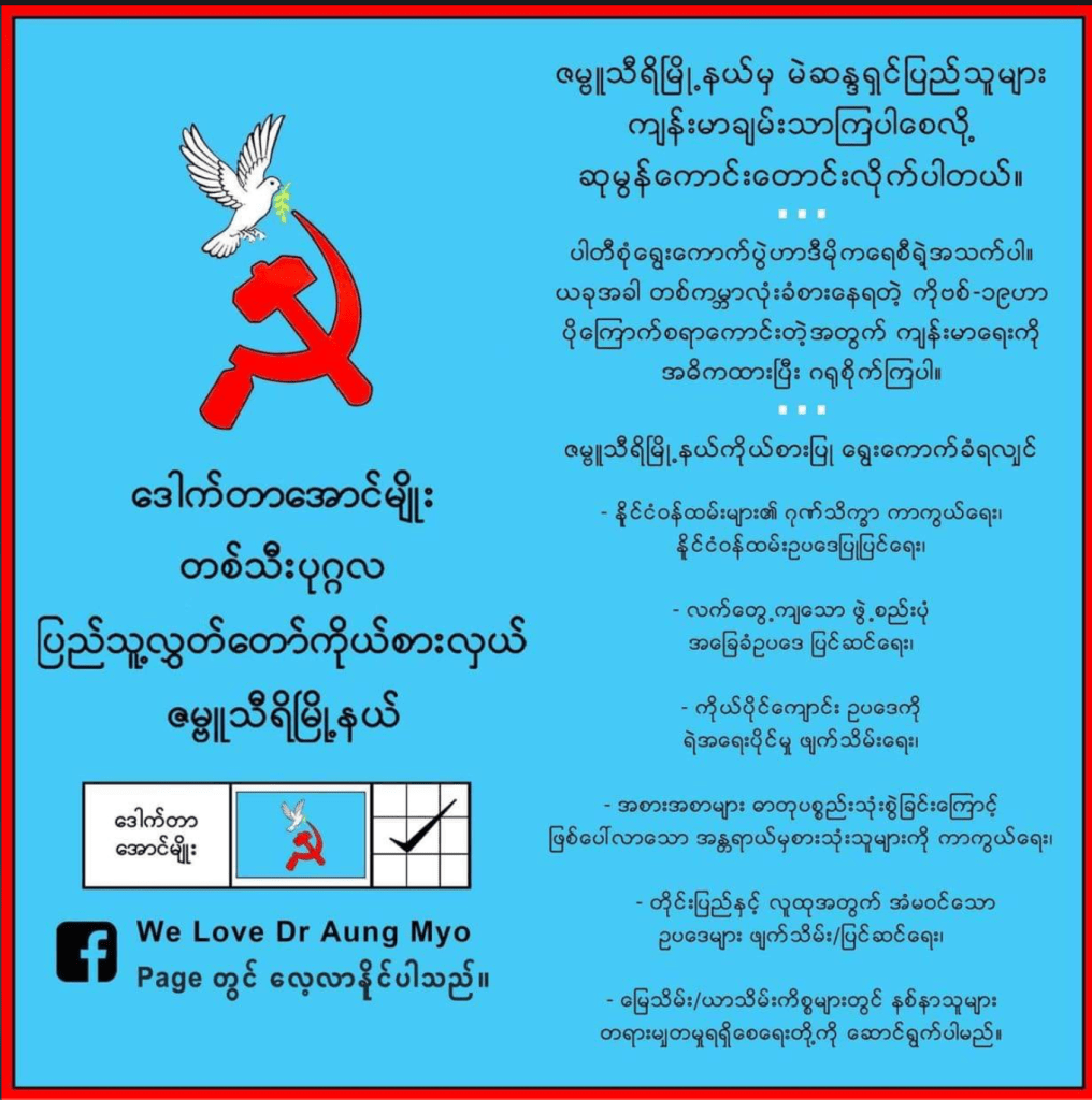 ဒေါက်တာအောင်မျိုး၊ တစ်သီးပုဂ္ဂလ ၊ ပြည်သူ့လွှတ်တော်ကိုယ်စားလှယ်လောင်း ၊ ဇမ္ဗူသီရိ မြို့နယ်၊ နေပြည်တော် ဟာလည်း ကျွန်တော်ထောက်ခံတဲ့ လွှတ်တော်ကိုု်ယ်စားလှယ်လောင်း တစ်ယောက်ပဲ။ ကျွန်တော်သာ နေပြည်တော်မှာ ရှိနေမယ်ဆိုရင် သူ့အတွက် ကိုယ်တိုင် နယ်မြေ ဆင်းပြီး မဲဆွယ်ပေးမိမှာပဲ။